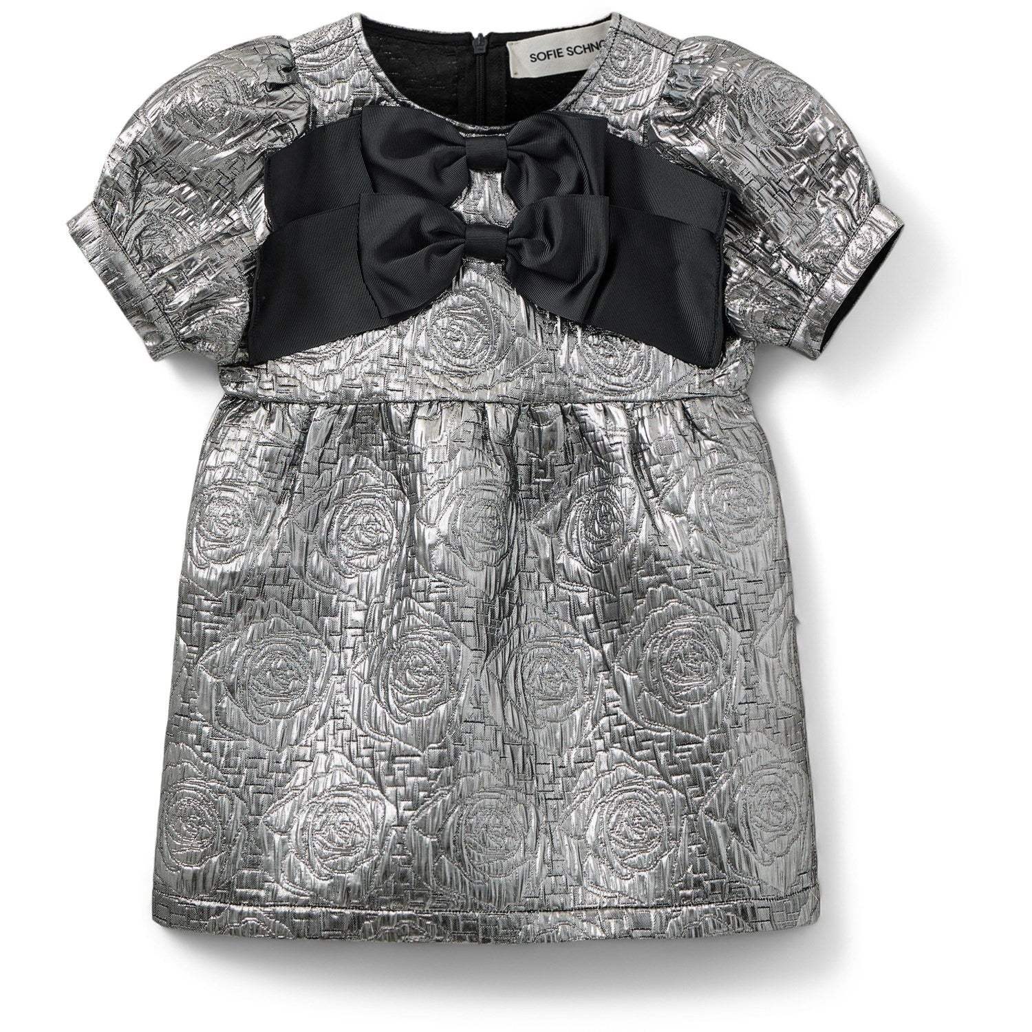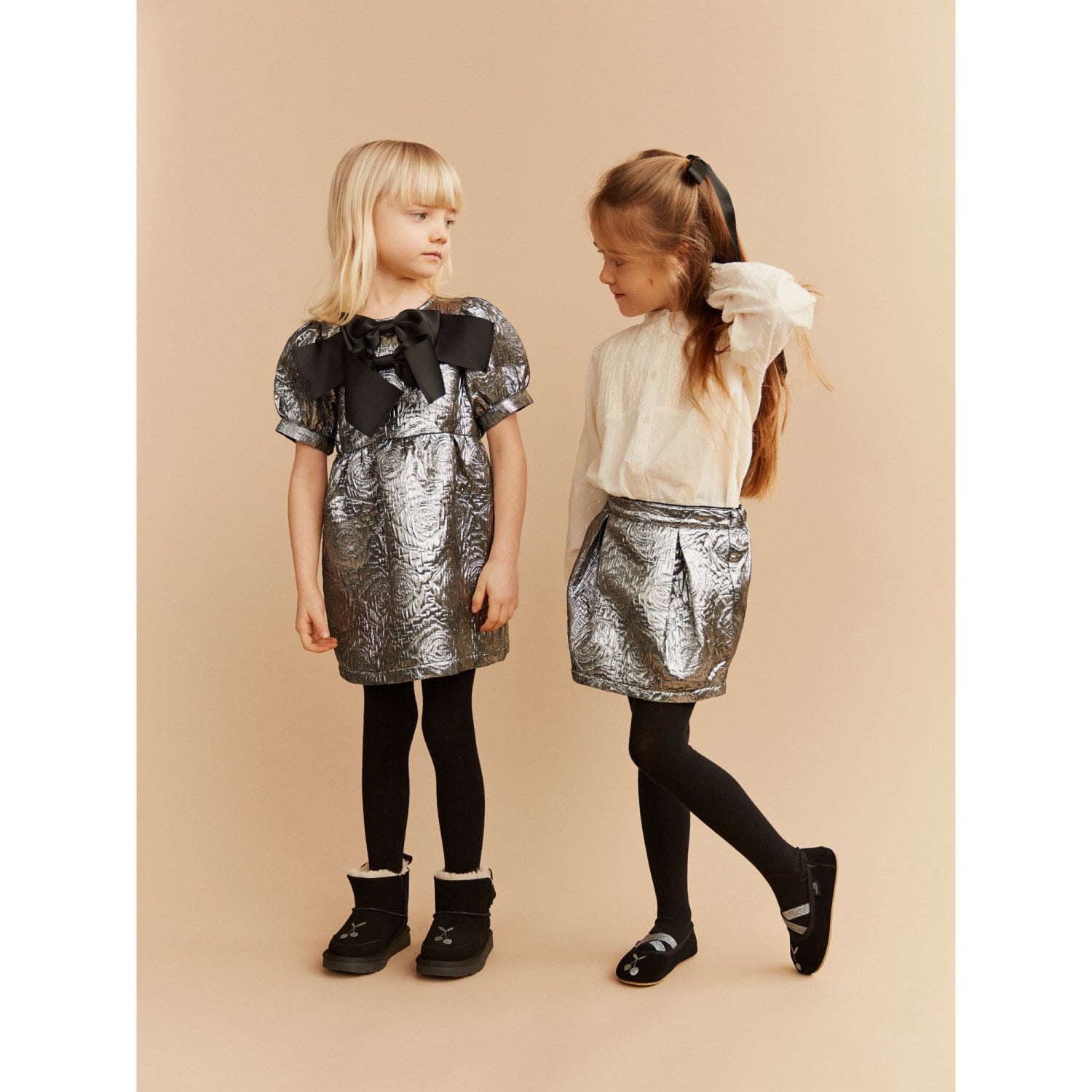 La den lille stjernen din skinne i denne søte Sofie Schnoor sølvkjolen! Kjolen er utsmykket med vakre svarte sløyfer som tilfører et snev av eleganse, mens de lett puffede ermene og den fine strukturen gir et lekent uttrykk. Perfekt til festlige anledninger eller en stilig hverdag. Glidelåsen i nakken sørger for enkel påkledning. Dette er kjolen som vil få enhver liten prinsesse til å føle seg veldig spesiell!