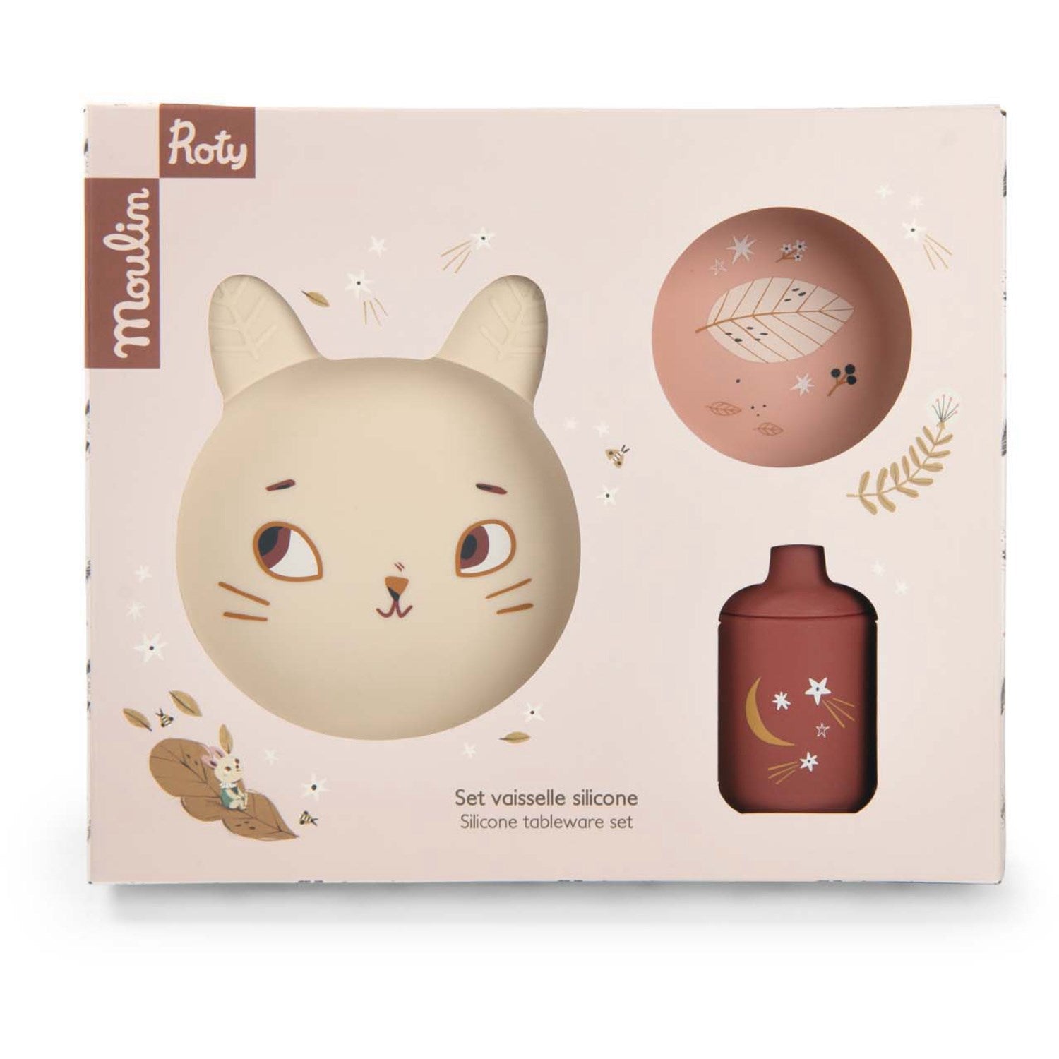 Oppdag Moulin Roty Mitt Første Spisestuesett fra Après La Pluie-serien, som er spesielt designet for å gjøre måltidene trygge og morsomme for de små. Dette settet er laget av slitesterk silikon og inneholder en tallerken, bolle, samt en tutkopp med to håndtak, alle dekorert med sjarmerende illustrasjoner. Perfekt for små hender, settet er både mikrobølge- og oppvaskmaskinsikkert, noe som gjør vedlikeholdet enkelt og praktisk.