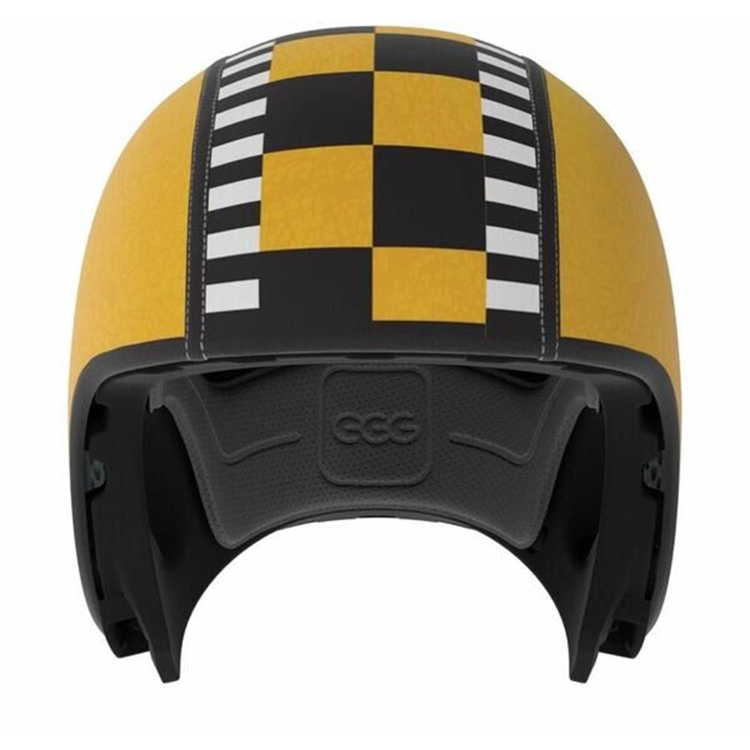 Gult racerkjører overtrekk til EGG helmets. EGG Helmets skin er et overtrekk til multi-hjelmen som kan skiftes på bare få sekunder og tilpasses etter humør, stil og fantasi.