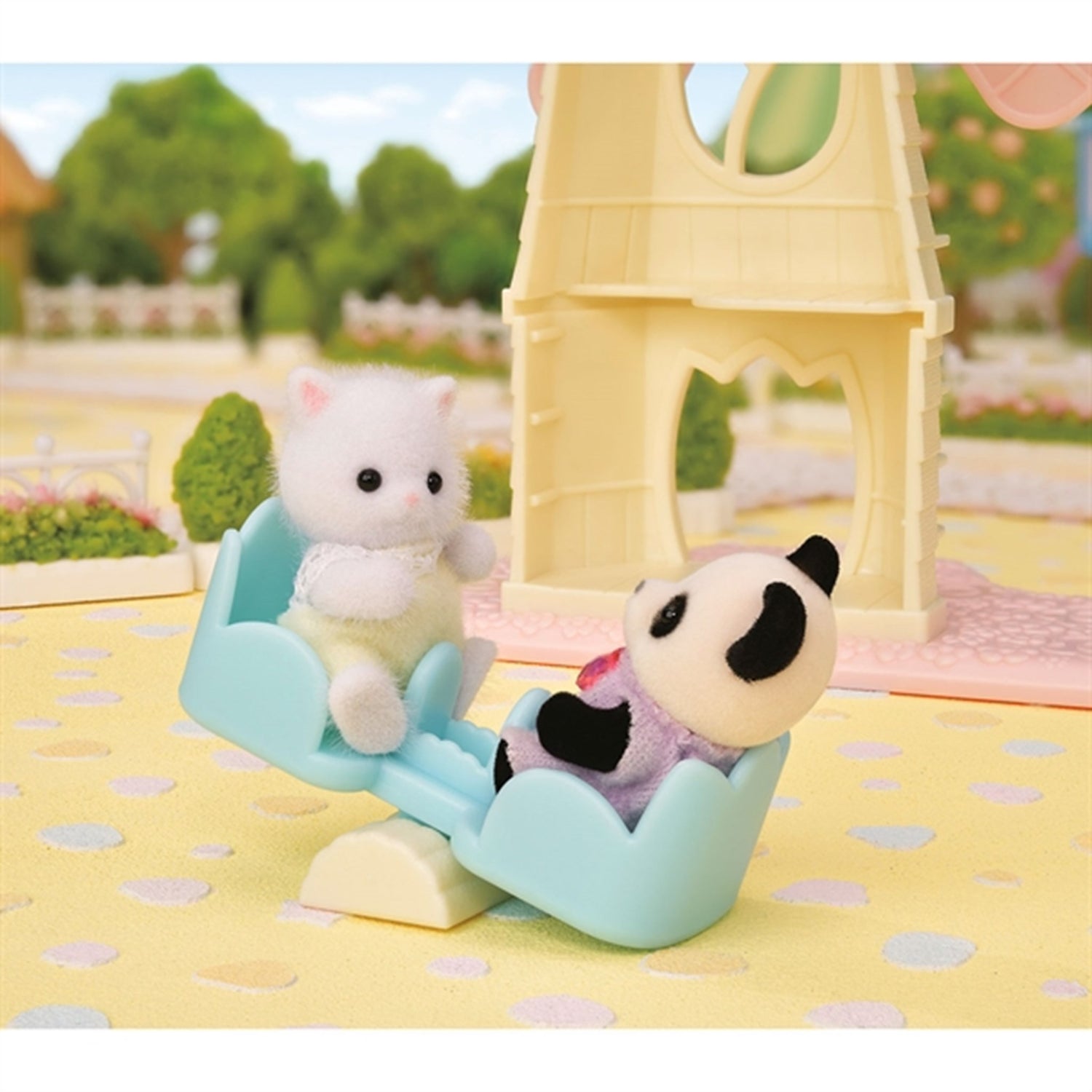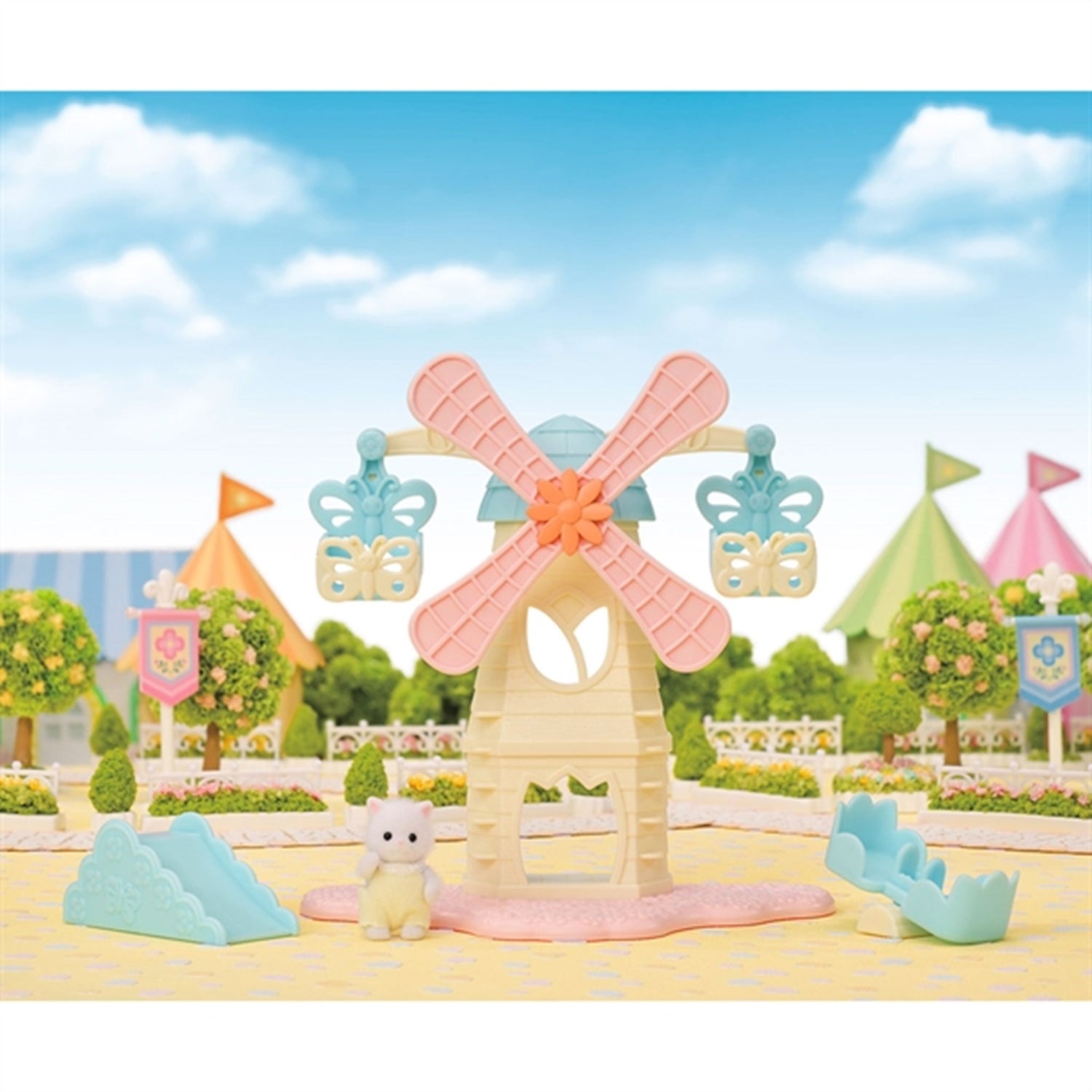 - Inkluderer vindmølle med to gondoler, sklie, vippe, babyfigur på ca. 4 cm