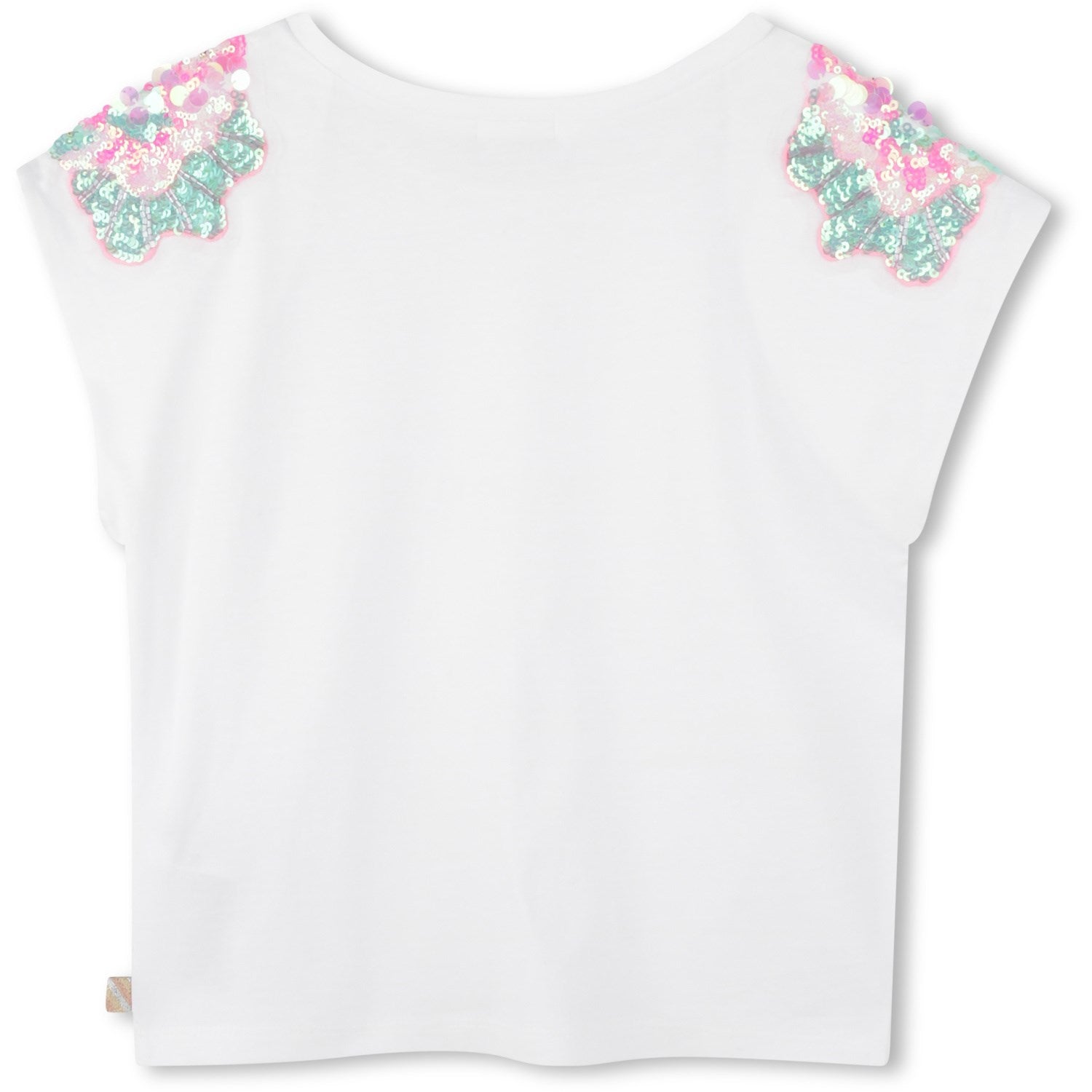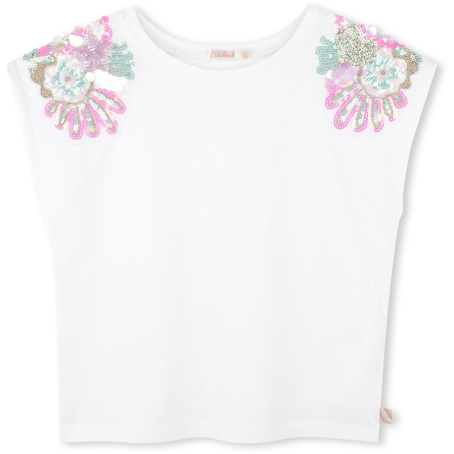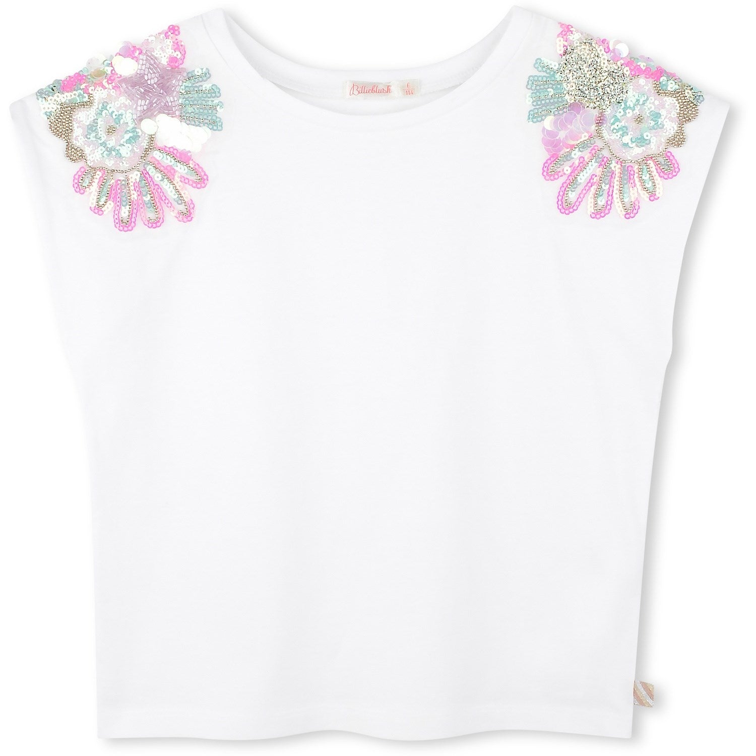 Denne vakre hvite t-skjorten fra Billieblush er perfekt for din lille fashionista! Med sitt myke jerseystoff, korte ermer og runde hals sørger den for komfortabel komfort hele dagen. Den morsomme vrien? Glitrende paljetter på skuldrene gir et snev av glamour. Denne t-skjorten er lett og luftig, og er klar for lekedager og eventyr.
