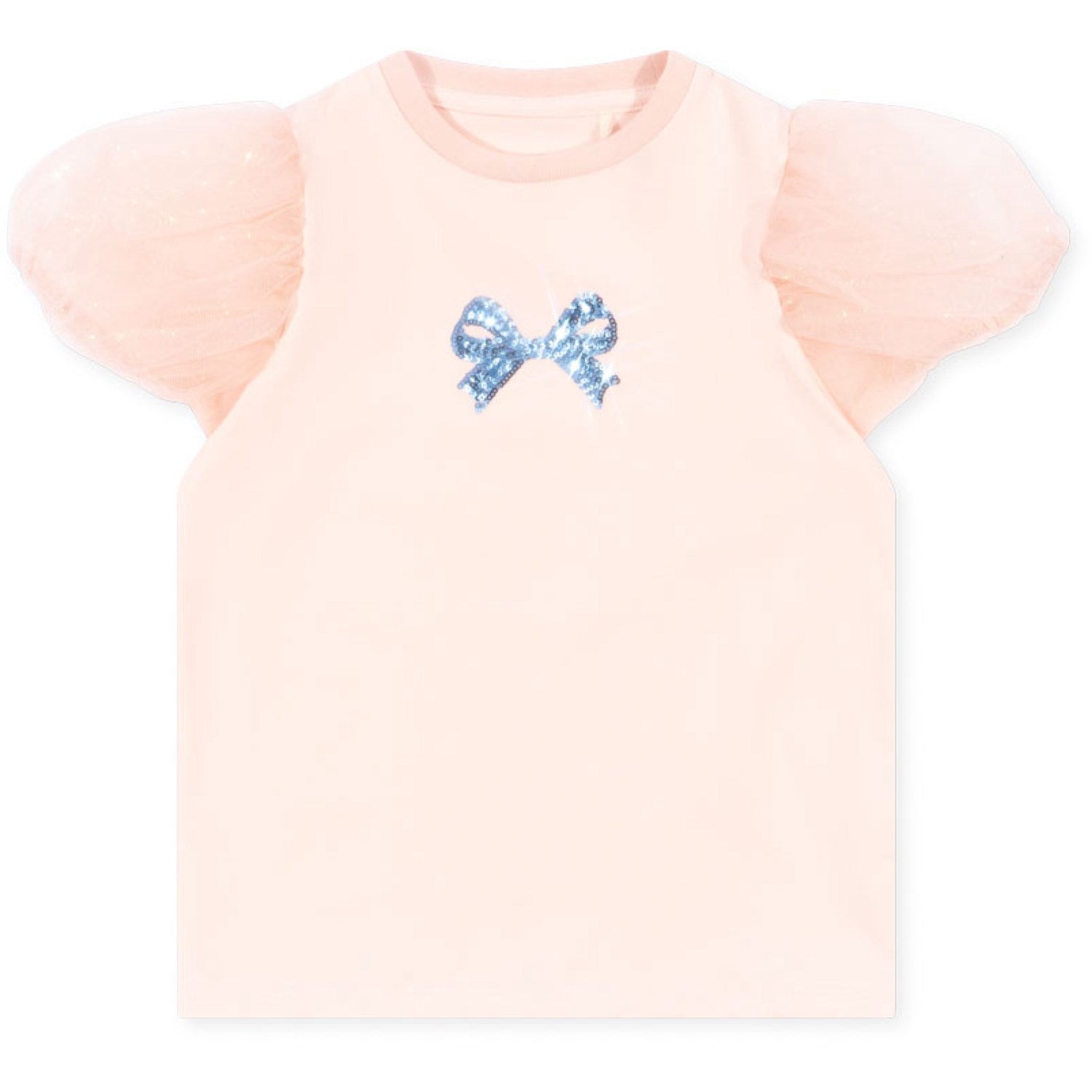 Oppdag den sjarmerende Konges Sløjd Pale Dogwood Ballerinasko T-skjorten, perfekt for enhver liten danser. Laget med en behagelig bomullsblanding (95% bomull, 5% spandex), denne t-skjorten har yndige puffermer av polyester tyll, dekorert med skinnende glitter og paljetter. Plagget skiller seg ut med sin gyldenrosa farge og ballettinspirerte stil. Vaskes enkelt og bevarer formen takket være høykvalitetsmaterialer og OEKO-TEX® STANDARD 100 sertifisering. Et must for små trendsettere, kombinerer komfort og stil på lekeplassen så vel som i bursdagsselskaper.