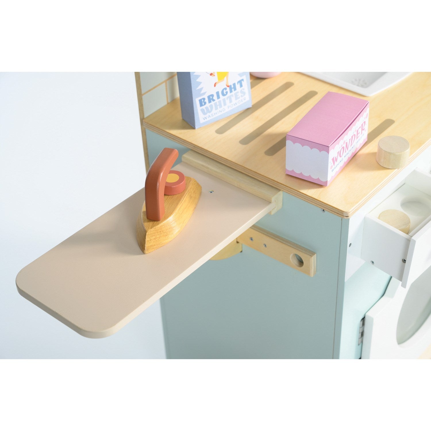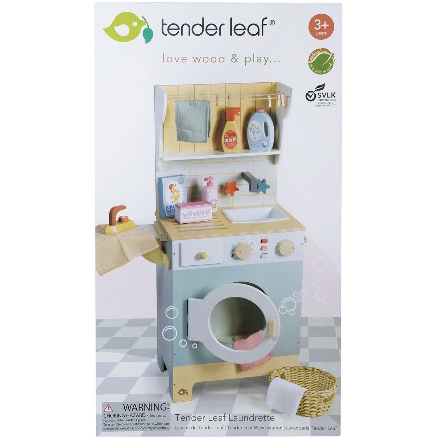 - Inkluderer vaskemidler (3 laget av tre og 2 laget av papp), et strykejern, treklemmer og en flettet kurv