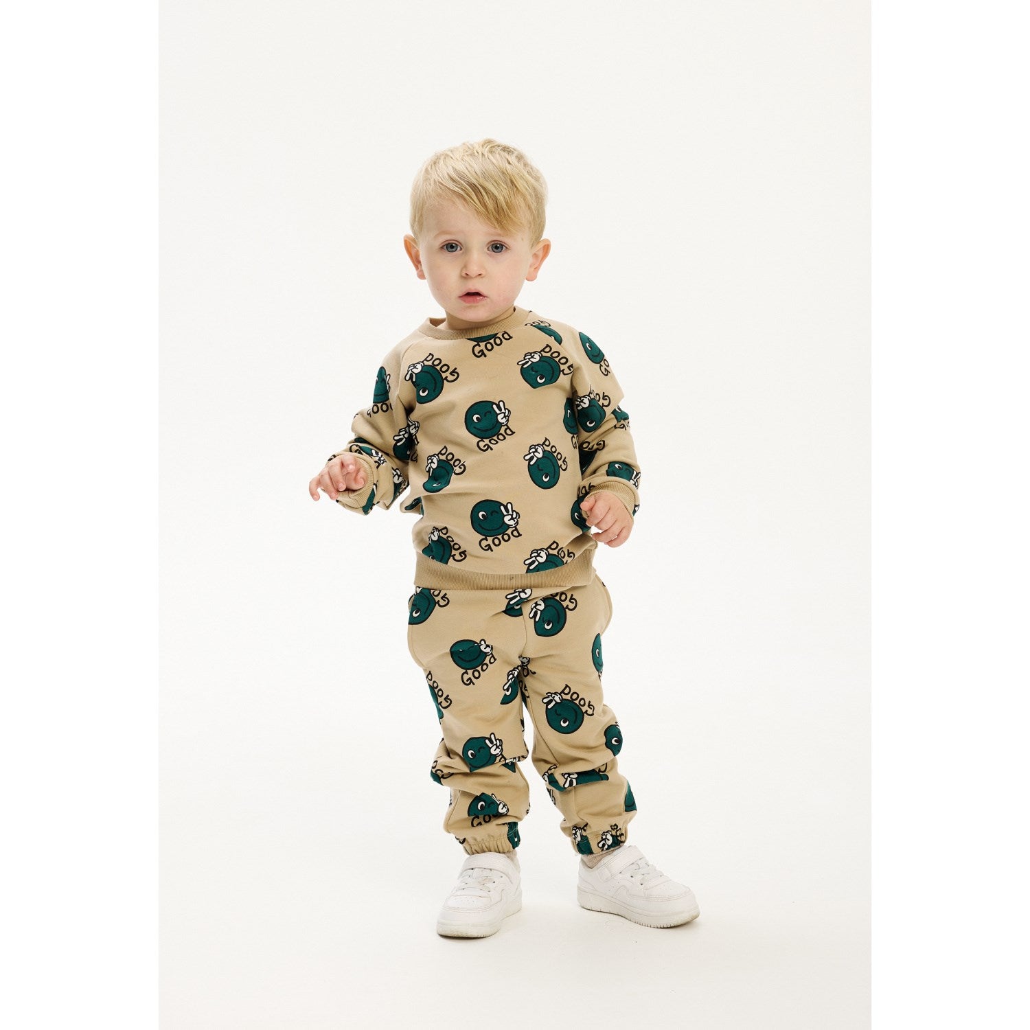 Gjør hverdagen litt morsommere med THE NEW Siblings Humus AOP Phil Sweatpants. Dette er joggebukser som garantert blir barnets nye favoritt, med sitt muntre og unike design av et blinkende smilefjes kombinert med teksten "Bra". Det heldekkende trykket gjør dem ekstra kule, mens den myke kvaliteten sikrer at de holder seg komfortable hele dagen.