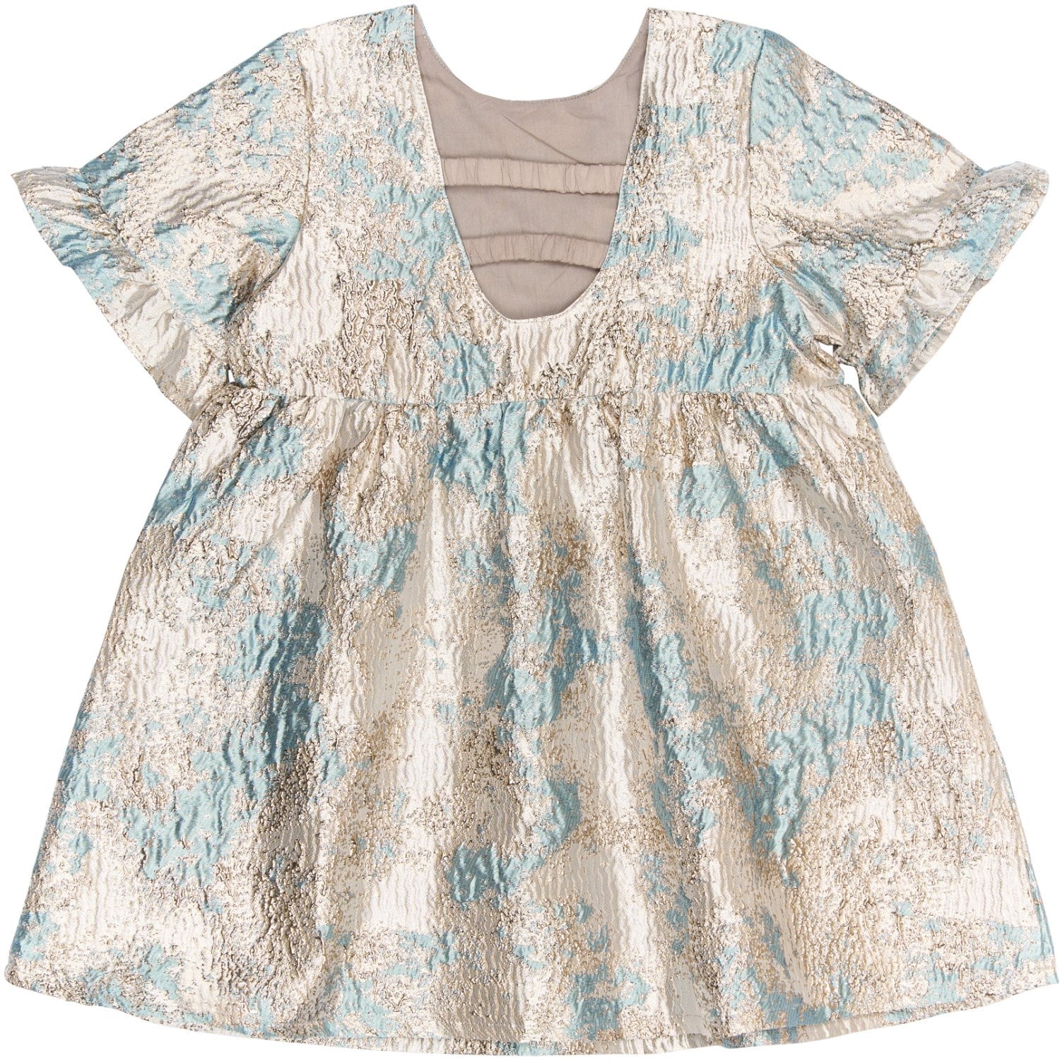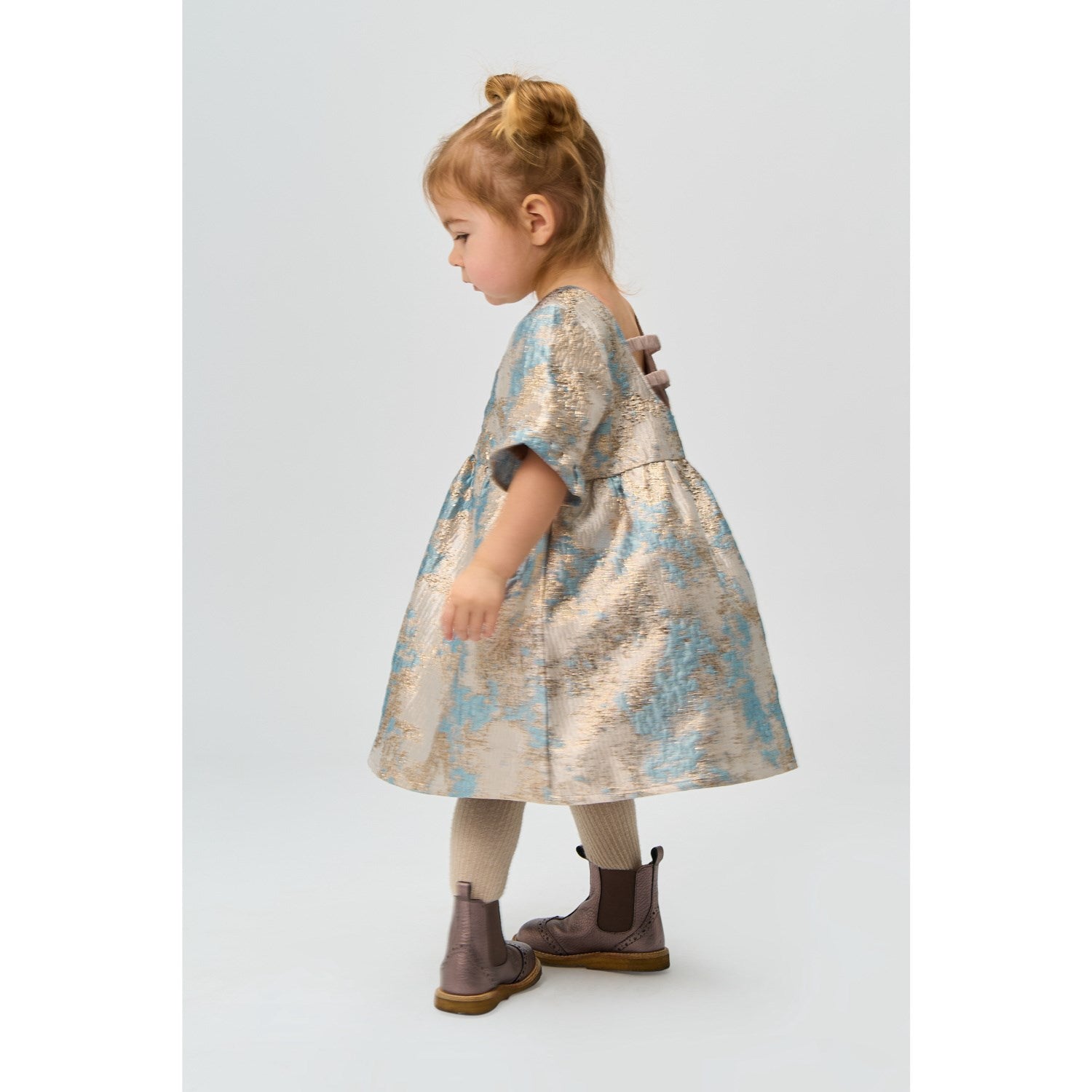 La din lille stjerne lyse opp enhver sammenkomst med THE NEW Siblings Tempest Reese S_S Kjole. Dette elegante plagget er ideelt for festlige anledninger, laget av skinnende jacquardstoff beriket med et innbydende blomstermønster. Kjolens utsvingte silhuett og myke volum, kombinert med korte flagrende ermer, tilfører en luftig og festlig følelse til ethvert arrangement.