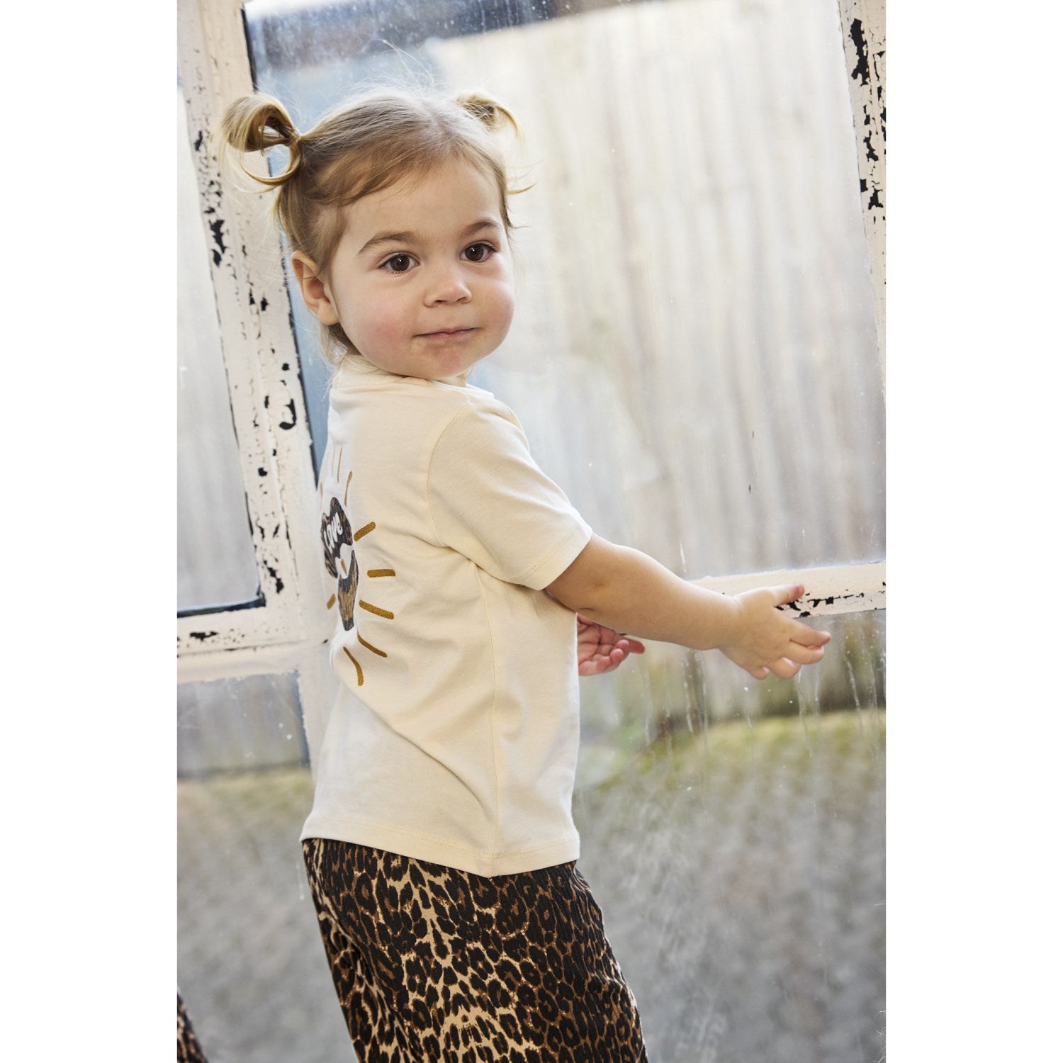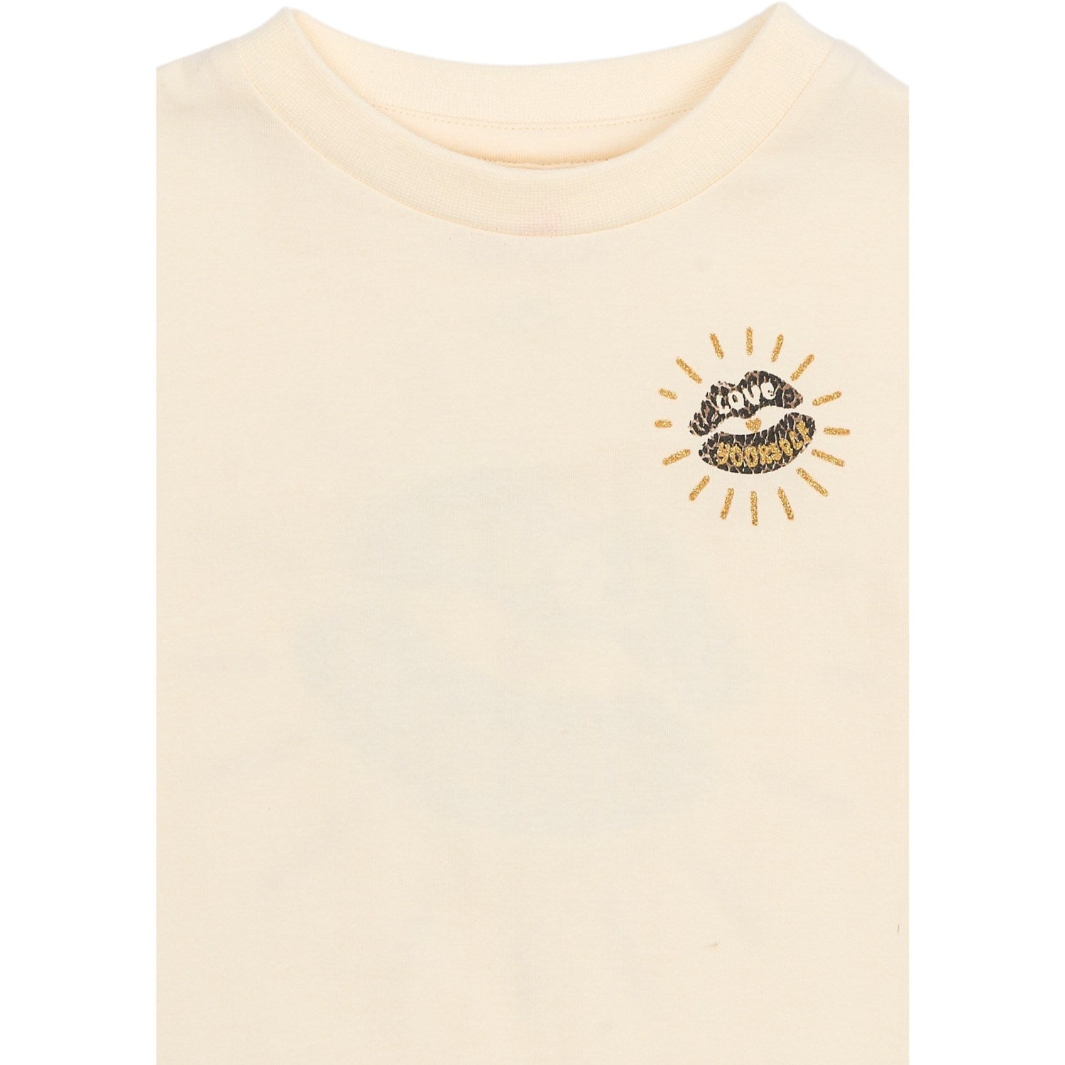 Gled barnet ditt med en sjarmerende og stilfull T-skjorte fra THE NEW siblings. Dette plagget er ikke bare trendy med sitt unike fronttrykk av lepper med dyreprint og gullglitterdetaljer, men det fremmer også positive budskap som "Elsk deg selv", omgitt av glitrende stråler. Dette tilsier en design som oppmuntrer til selvtillit og egenkjærlighet, en viktig verdi for voksende barn.