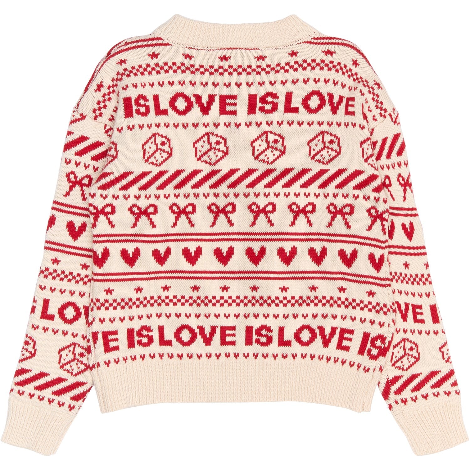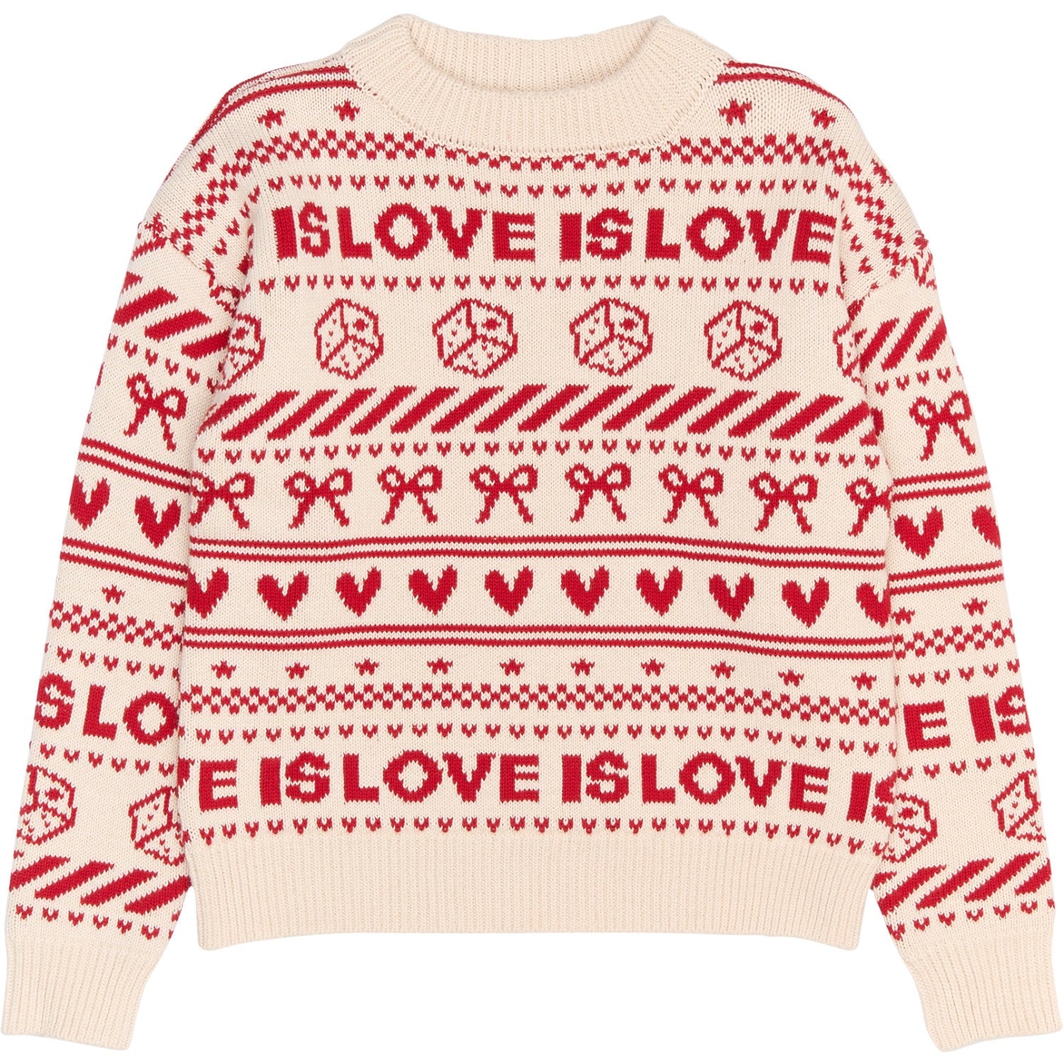 Gled deg over stilig komfort med New Gardenia AOP Raline Jacquard Pullover fra THE NEW. Dette plagget forener funksjonalitet med mote i et nydelig jacquard-strikk i en delikat kremfarge, beriket med livlige røde detaljer og varierte mønstre som terninger, sløyfer, striper, hjerter og ruter. Teksten "Love is love" løfter designet ytterligere, og gjør denne genseren til mer enn bare en varmekilde – den er også en statement piece. Den koselige passformen sikrer at barnet holder seg behagelig gjennom alle aktiviteter, mens den slitesterke kvaliteten gjør genseren enkel å vedlikeholde. Et ideelt valg for kalde dager, som garantert vil holde små kropper både varme og moteriktige.