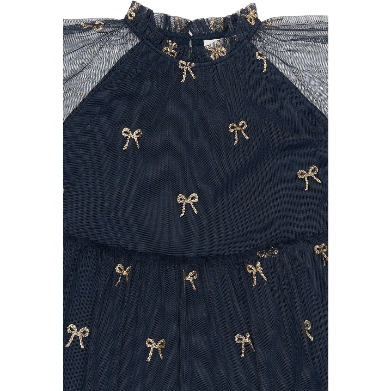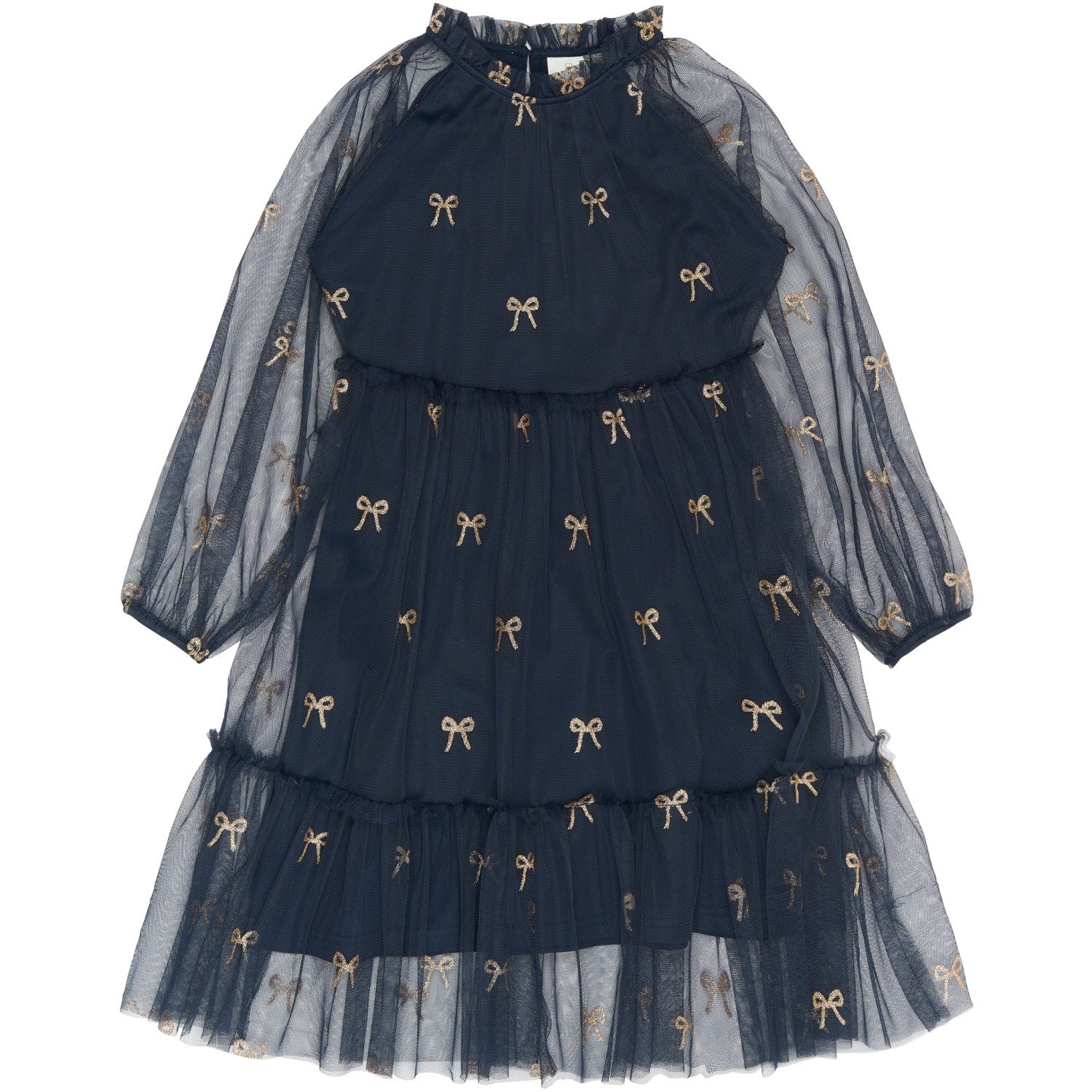 Oppdag barnas nye yndlingskjole for enhver festlig anledning – The New Navy Blazer AOP Rudelle L_S Kjole. Dette plagget kombinerer elegant design og komfortabel bruk, perfekt for små fashionistaer. Kjolen er utsmykket med sjarmerende gullglittersløyfer som tilfører et snev av glam, og er laget med en myk bomullsunderkjole under et luftig lag av gjennomsiktig mesh. Den smarte A-linjeformen sammen med elastiske mansjetter og midje sørger for en behagelig passform som tillater allsidig bevegelse under lek og festligheter. Med en praktisk knappelukking i nakken, er den også enkel å ta av og på. Gled dine små med både stil og komfort, enten det er til bursdagsfest eller et familiearrangement.