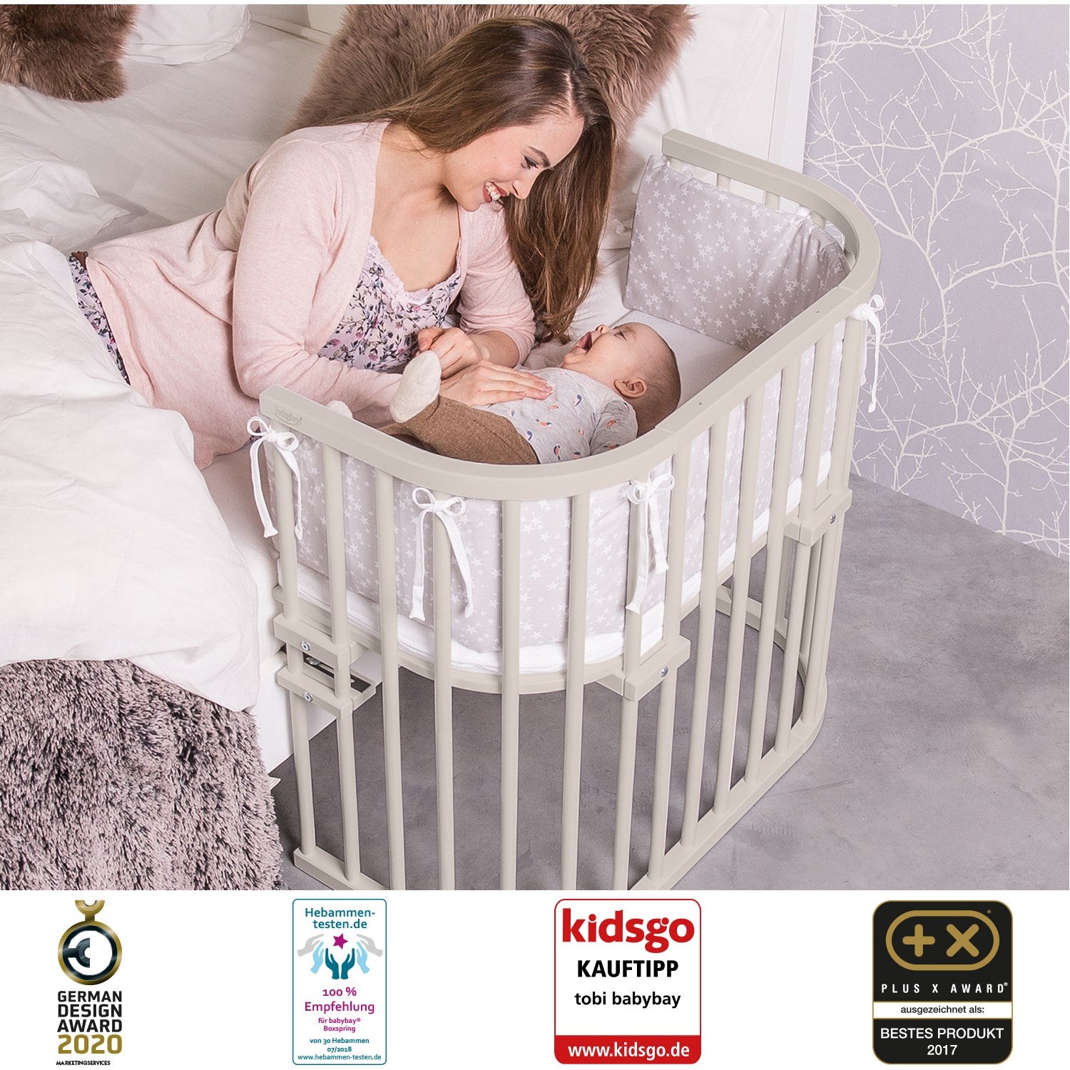 For de som ser etter holdbarhet og sikkerhet, er babybay® Original TÜV-testet, og bruker kun giftfrie, spyttbestandige lakker, noe som garanterer et sikkert miljø for babyen. Dens robuste konstruksjon kan håndtere en belastning opp til 150 kg, så du kan være trygg på at den tåler daglig bruk. Og når barnet vokser, transformeres enkelt co-sleeperen til alt fra skrivebord til lekebord, noe som gjør babybay® til en langsiktig investering i barnets rom. Materialer: bøk tre