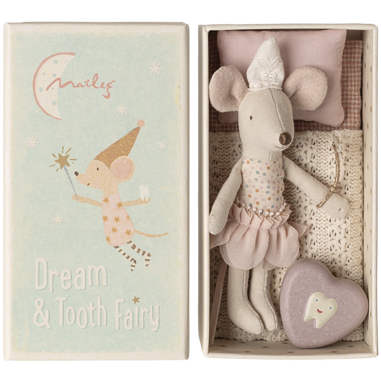 La Maileg Tannfe Mus, Lillesøster i Tændstikæske, er den perfekte magiske følgesvennen for barna. Dette sjarmerende leketøyet, kledd i fe-inspirerte klær, kommer med mykt sengetøy for nattetid eventyr. Settet inkluderer også en liten tannboks, ideell for å bevare barnets melketenner. Lett å bære og lagre, gir denne tøydukken både underholdning og læring, og bidrar til å utvikle barnets fantasi og følelse av ansvar. En sikkert hit for småbarn som elsker magiske historier og rollespill.