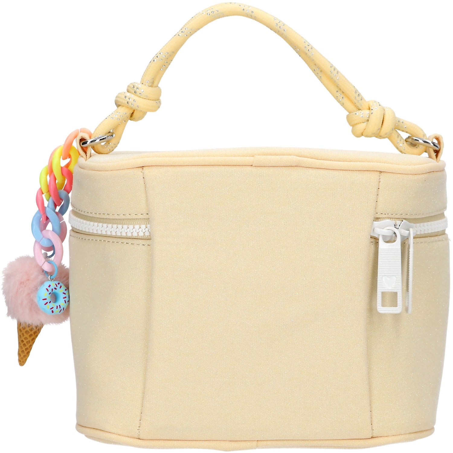 Gjør deg klar for et eventyr av farger og moro med TOPModel Candy Glam Cosmetic Case! Denne glitrende sminke- og neglelakkvesken er ikke bare fengende med sin strålende, gule farge og glitrende materialer, men også utrolig praktisk. Designet er barnvennlig med et dobbeltmodellmotiv på forsiden og et fargekoordinert håndtak på toppen. Perfekt for små hender å bære! For å legge litt ekstra "søtt" til designet, kommer den med et fargerikt kjedeanheng prydet med en liten smultring og en myk iskremkjeks.