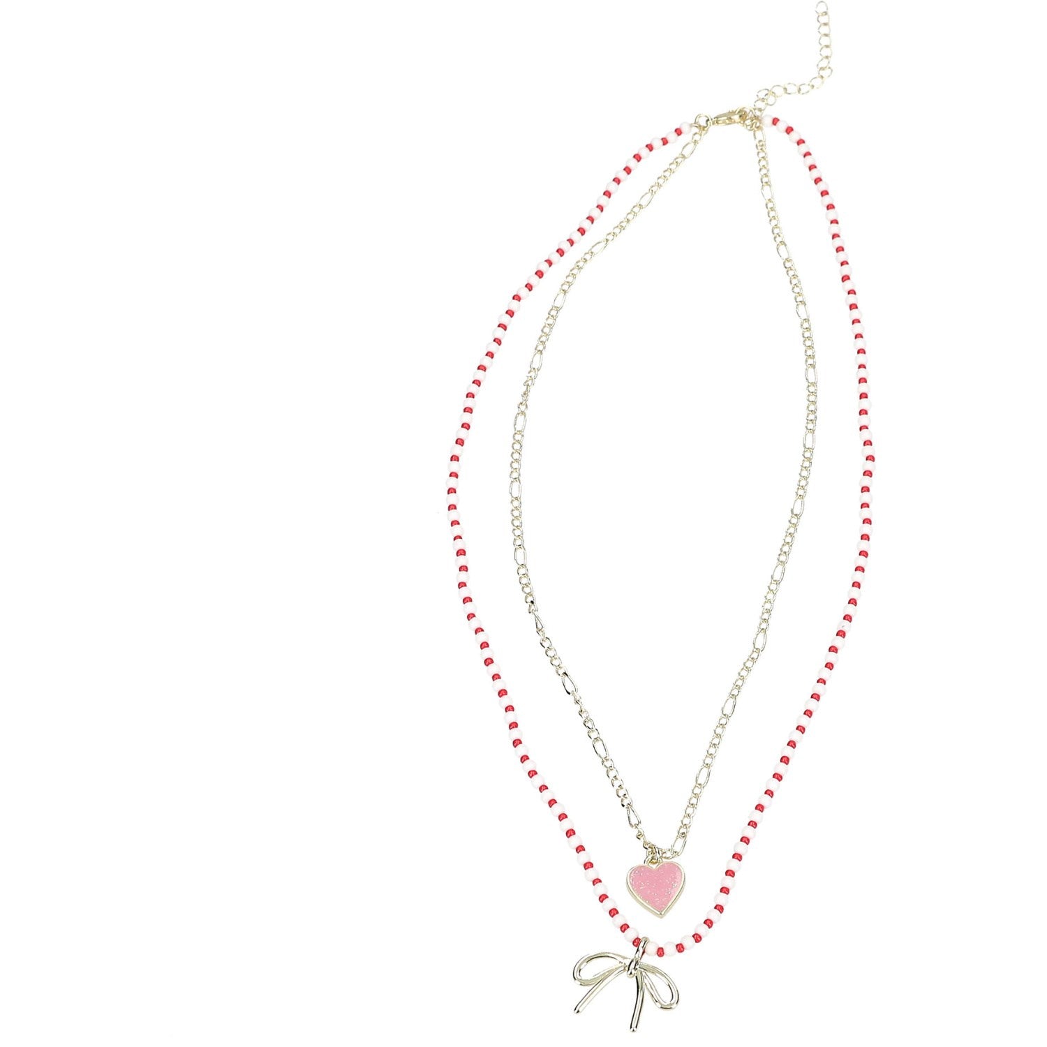 Oppdag det sjarmerende "Leoheart Dobbel Layer Necklace" fra TOPModel, perfekt for enhver liten moteentusiast. Dette doble halskjedet kombinerer et kortere, gullfarget kjede med et rosa glitterhjerte og et lengre kjede prydet med hvite og røde perler, toppet med et elegant gullfarget sløyfeanheng. Den totale lengden er 46,5 cm med en ekstra 5 cm justerbar lenke, som tilbyr en skreddersydd passform. Dette tilbehøret er ikke bare stilig, men også laget for å være komfortabelt og holdbart for daglig bruk. Gi antrekket et løft med dette øye-fangende tilbehøret som speiler barnets lekenhet og stil.