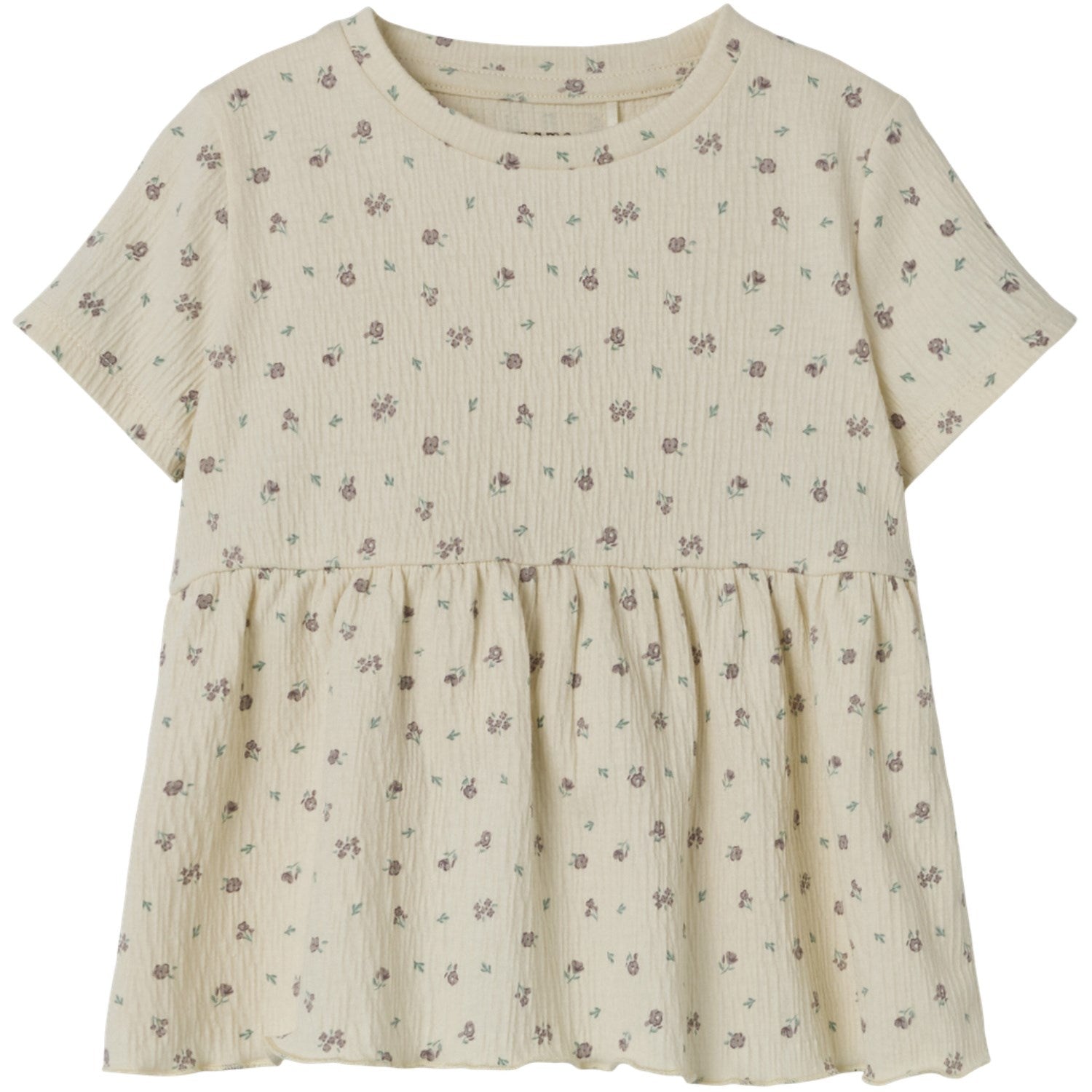 Toppens design inkluderer en klassisk rund hals og korte ermer, noe som gjør den velegnet for all slags vær. Det gjentatte mønsteret over hele overflaten tilfører et lekent og moderne preg, mens den rolige fargen, bleket sand, gjør den lett å kombinere med annet tøy. Denne toppen kommer i standard størrelser, noe som gjør det enkelt å finne den perfekte passform for ditt barn.