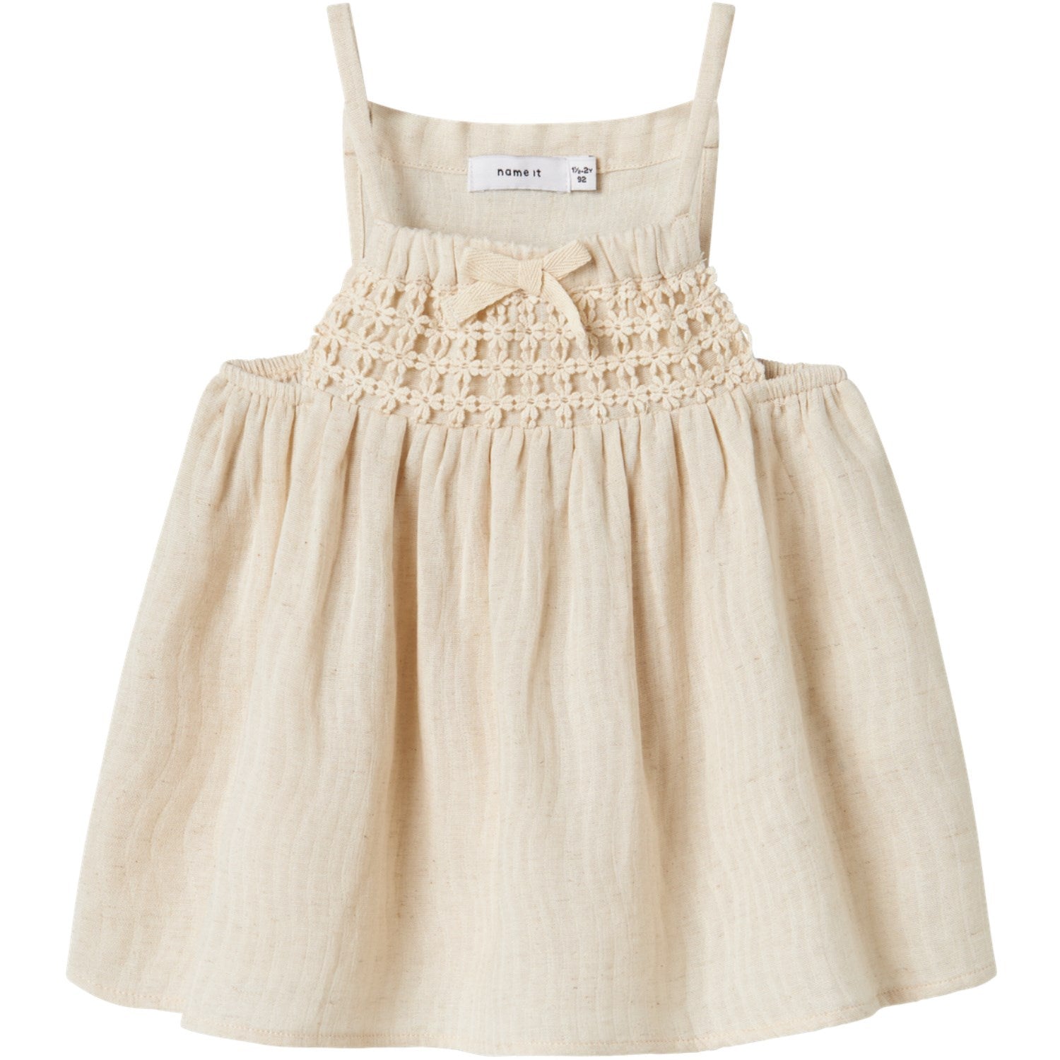 Oppdag den sjarmerende 'Name It Bleached Sand Jatti Stropp Topp', en drøm av et plagg for varme sommerdager. Denne toppen er laget av vevd materiale med en lett tekstur og et iøynefallende kryssmønster, sikrer både stil og komfort. Den firkantede halsen og ermeløse design gir en avslappet passform, perfekt for lek og moro under solen. Toppens buedetalj tilfører en ekstra søt touch, mens den lyse, bleket sand-fargen gir et friskt og tidløst utseende. Med letthet i vedlikehold og stor slitestyrke, er denne toppen en praktisk tillegg til ethvert barns sommergarderobe. Ideal for alt fra bursdagsselskaper til strandturer, denne toppen fra Name It fremmer både komfort og stil!