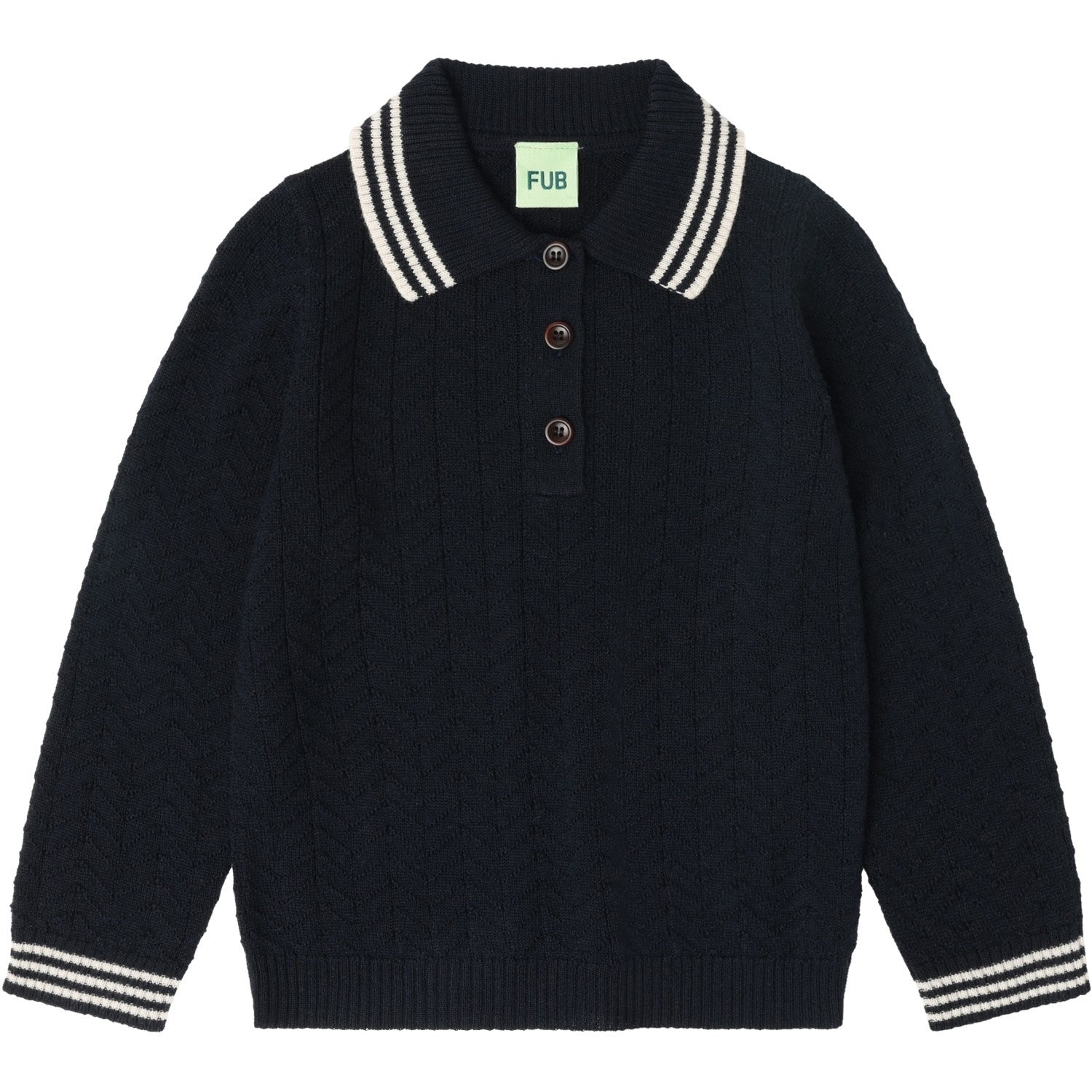Gjør barnets garderobe både stilfull og bærekraftig med vår FUB Dark Navy ZigZag Polo. Denne behagelige poloskjorten er laget av 100% OEKOTEX-sertifisert merinoull, kjent for sine myke og varme egenskaper, perfekt for kjøligere dager. Med sitt unike sikksakkmønster og mørkeblå farge, tilfører den et moderne preg til ethvert antrekk.