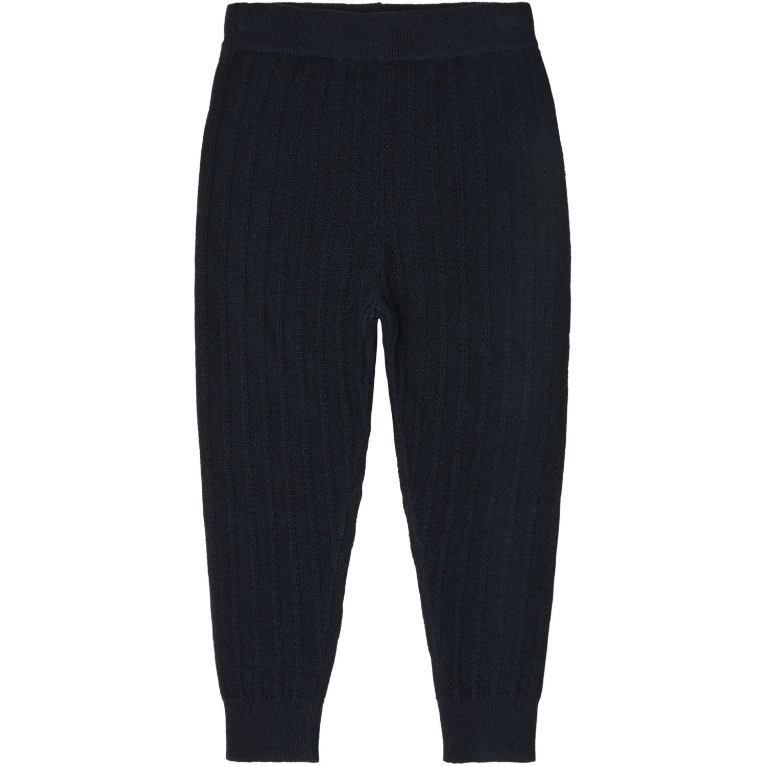 Det strikkede stoffet med ribbestrikkede mansjetter ved bena kombinert med det tidløse mørkeblå fargetemaet og valget mellom en solid eller stripete versjon legger til en sjarmerende touch. Takket være garnets behandling med miljøvennlig teknologi, er vedlikeholdet enkelt: buksene kan maskinvaskes uten bekymringer.