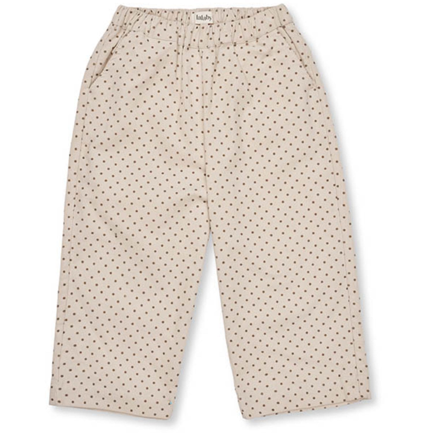 Gled barnet ditt med Lalaby BrownDot Frankie bukser, perfekte for lek og hverdagsbruk! Disse buksene er laget av mykt, slitesterkt materiale og har et sjarmerende brunt prikkmønster som lett matcher andre plagg. Den komfortable passformen og elastisk midje forsikrer at de sitter godt, uansett aktivitet. Vaskes enkelt i maskin for hyppig bruk. Ideelle for både inne- og utelek, Lalaby bukser kombinerer stil med funksjonalitet for den aktive barnehverdagen.