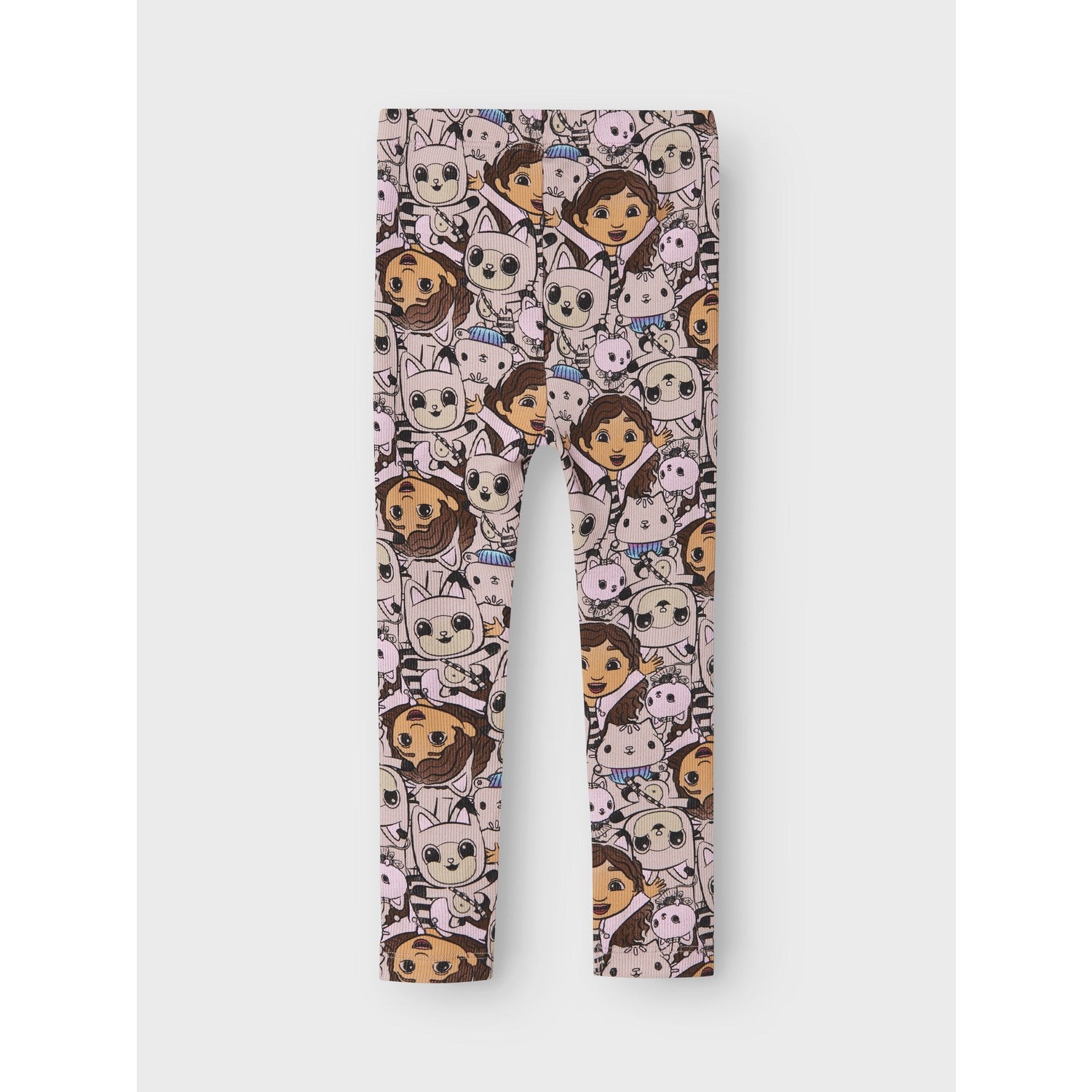 Leggingsene kommer i en delikat lilla farge, dekorert med et sjarmerende mønster inspirert av Gabby's Dollhouse, en populær serie som stimulerer barnas fantasi og eventyrlyst. Den middels høye midjen og den elastiske midjen tillater enkel påkledning og tilpasser seg etter barnets bevegelser, noe som gjør dem ideelle for all slags lek.