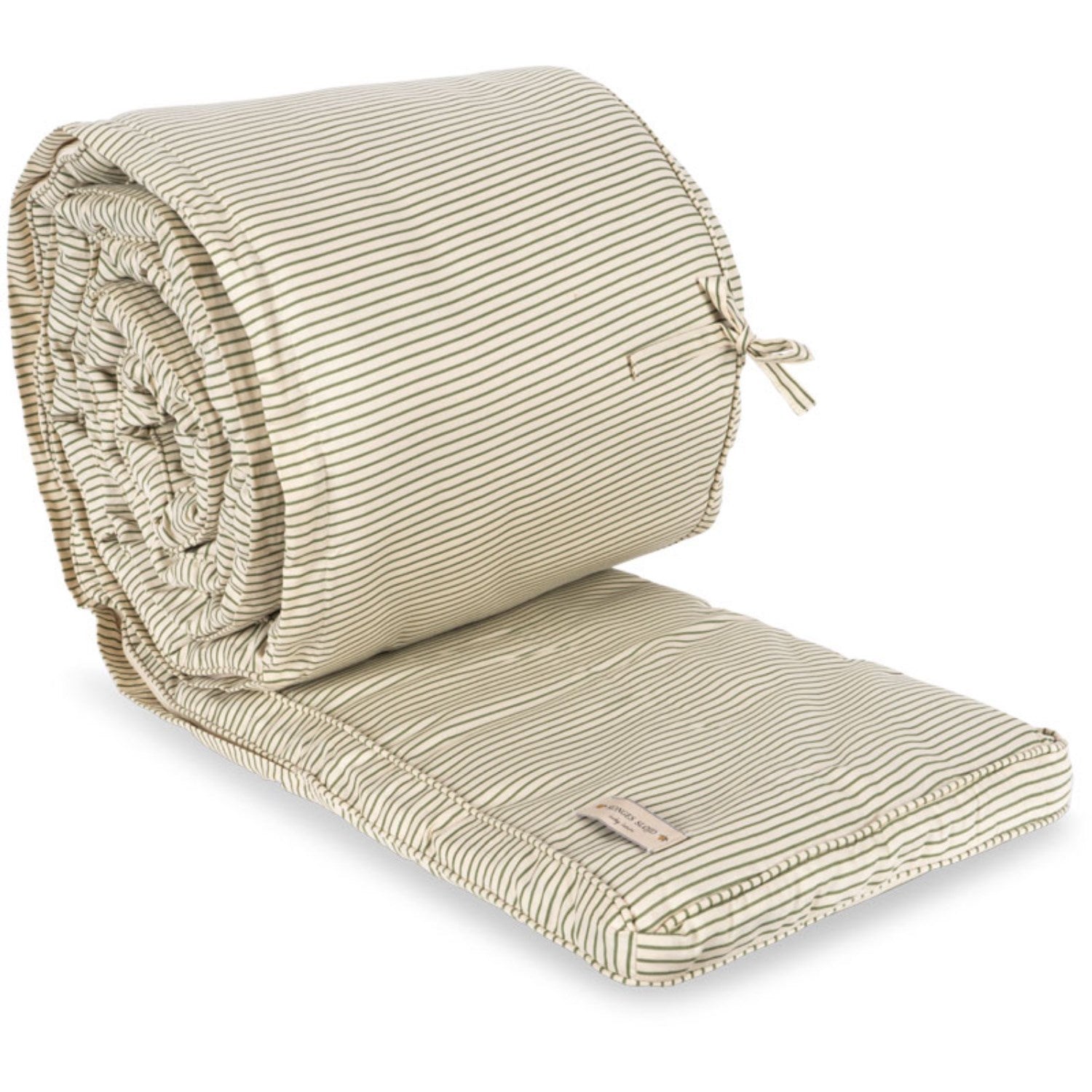 Gi ditt barn en trygg og behagelig søvn med vår Konges Sløjd Tea Stripe Sengeramme. Denne sengekanten er laget av 100 % økologisk bomull med en myk polyesterfylling, designet for å beskytte og omringe din lille med komfort. Produktet er sikkerhetsgodkjent med OEKO-TEX® STANDARD 100, klasse 1 sertifisering, og møter også EN 16780:2018 standardene, så du kan være trygg på at ditt barn sover sikkert. Den er enkel å bruke og vedlikeholde, og kan også fungere som en stimulerende og underholdende del av barnets sovemiljø med sine fargerike striper. Husk alltid å fjerne sengekanten når barnet kan sitte uten hjelp for å unngå risiko.