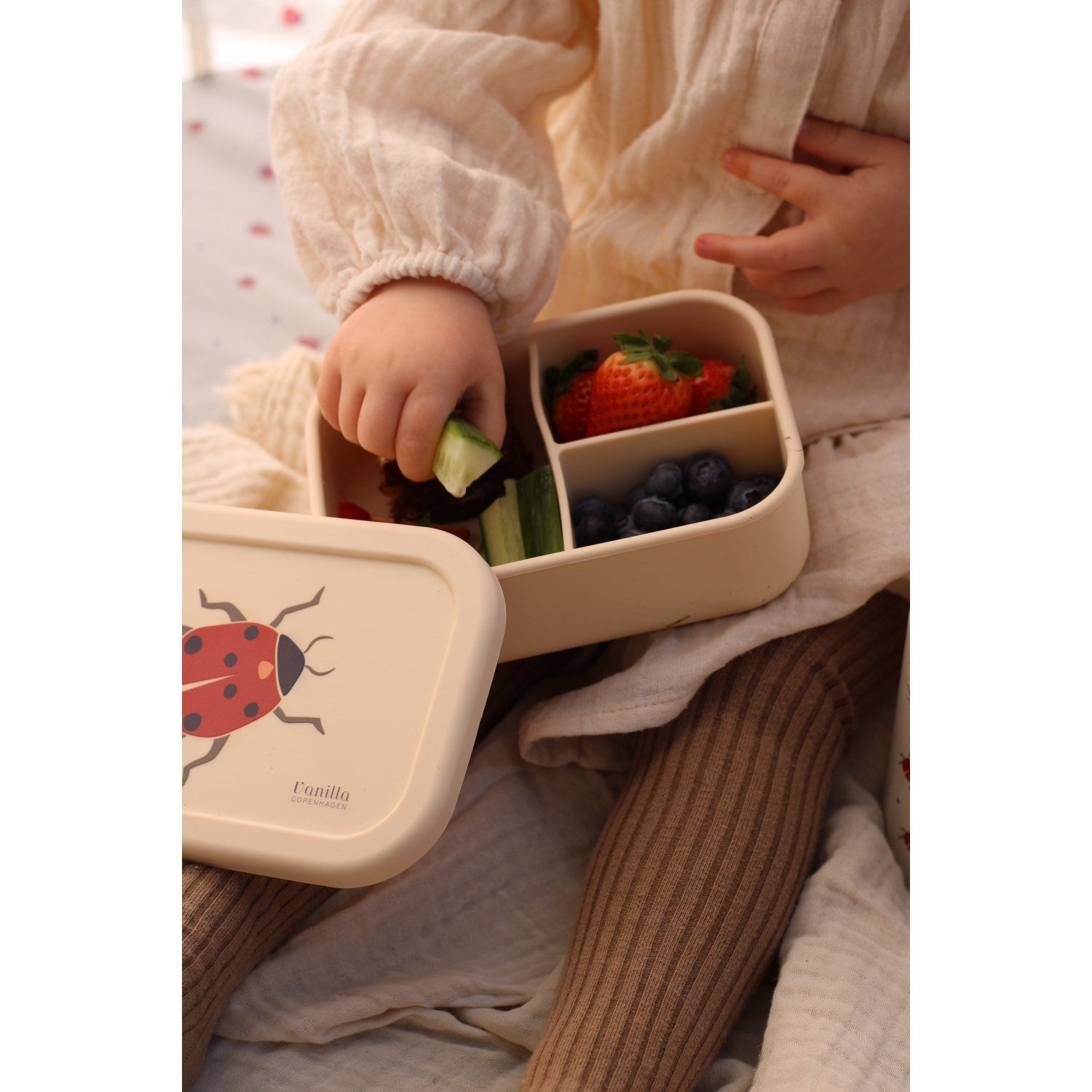 Oppdag Vanilla COPENHAGEN Lady Lovebug matboks i silikon, designet spesielt for barn. Denne matboksen er ikke bare sikker og godkjent etter de høyeste standardene, men også enkel å bruke. Med sitt komfortable design og slitesterke materiale, sørger den for at maten holder seg frisk. Silikonmaterialet gjør den enkel å rengjøre, og dens allsidighet betyr at den kan brukes til ulike typer matvarer, perfekt tilpasset den lille sin hverdag. Denne matboksen står for både moro og stimulering, med sitt tiltalende og barnevennlige design.