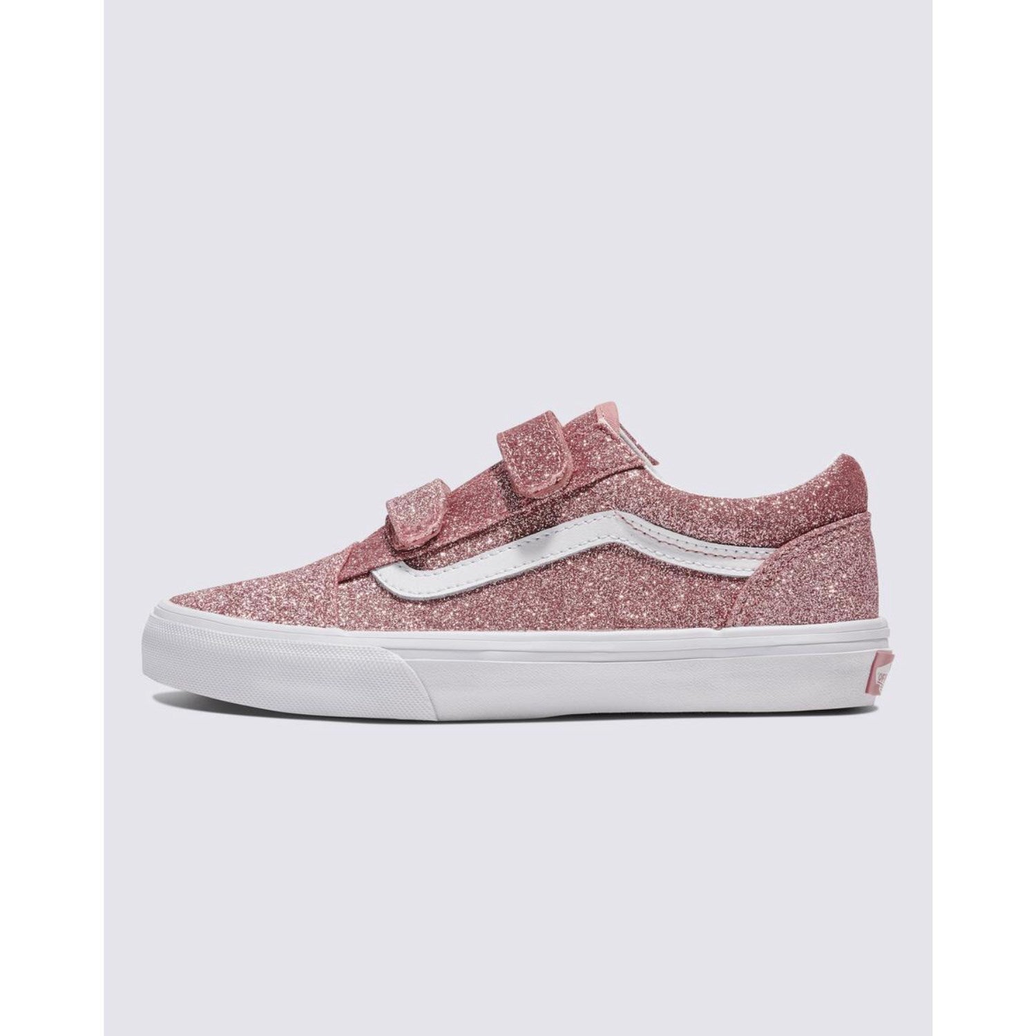 Oppdag de sjarmerende VANS Rose Gold Old Skool V Glitter-sneakersene, perfekte for barn som elsker å skinne! Laget med et blendende glitterdesign i en iøynefallende roségullfarge, kombinerer disse skoene stil med komfort. Den justerbare borrelåsen og den solide gummisålen sikrer en perfekt passform og slitestyrke, ideelt for daglig bruk. Lettstelte og designet for å støtte små føtter i alle bevegelser, disse VANS-skoene vil raskt bli en favoritt både for barn og foreldre!