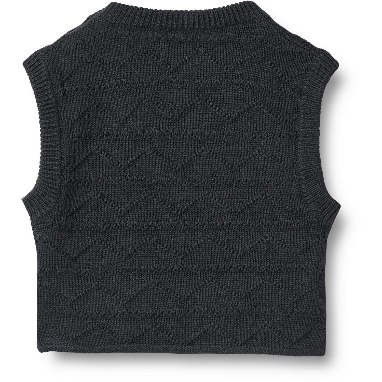 Oppdag den sjarmerende Wheat Navy Knit Vest Bobby, designet med et øye for både komfort og stil for barnet ditt. Denne vesten, laget av 100 % økologisk bomull og sertifisert av GOTS, gir en myk og allergivennlig opplevelse uten irritasjon. Med sin klassiske, normale passform og ribbestrikkede kanter i halsen samt ermeåpningene sikres en optimal passform og bekvemmelighet. Det unike teksturerte strikkemønsteret i sikksakk foran gir en moderne vri, mens den rullede falden gir en avslappet stil.