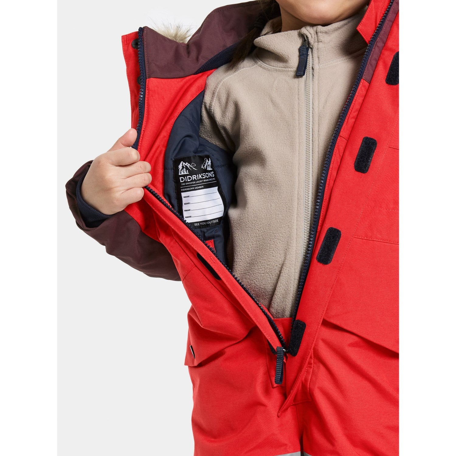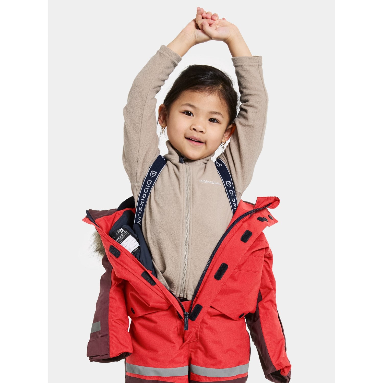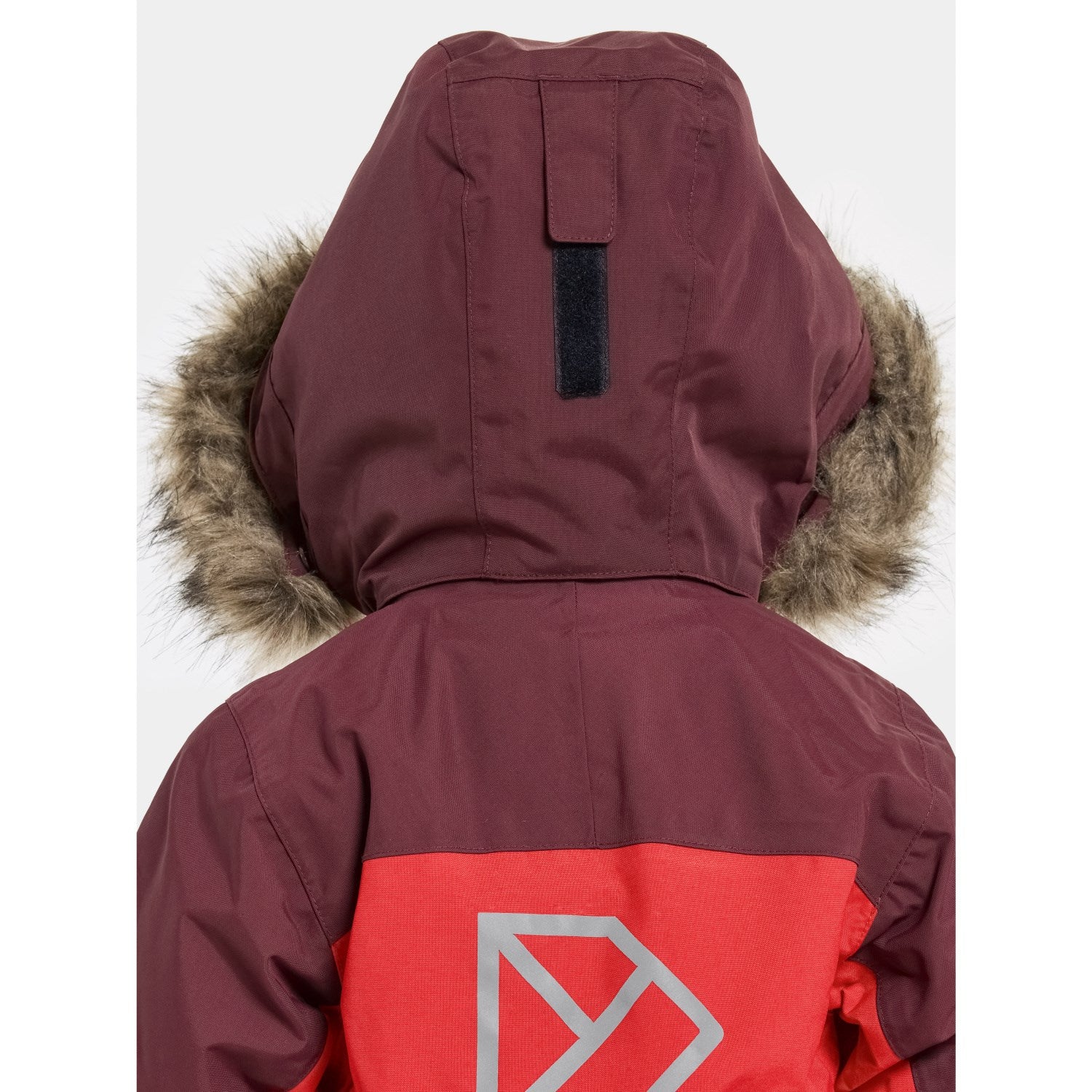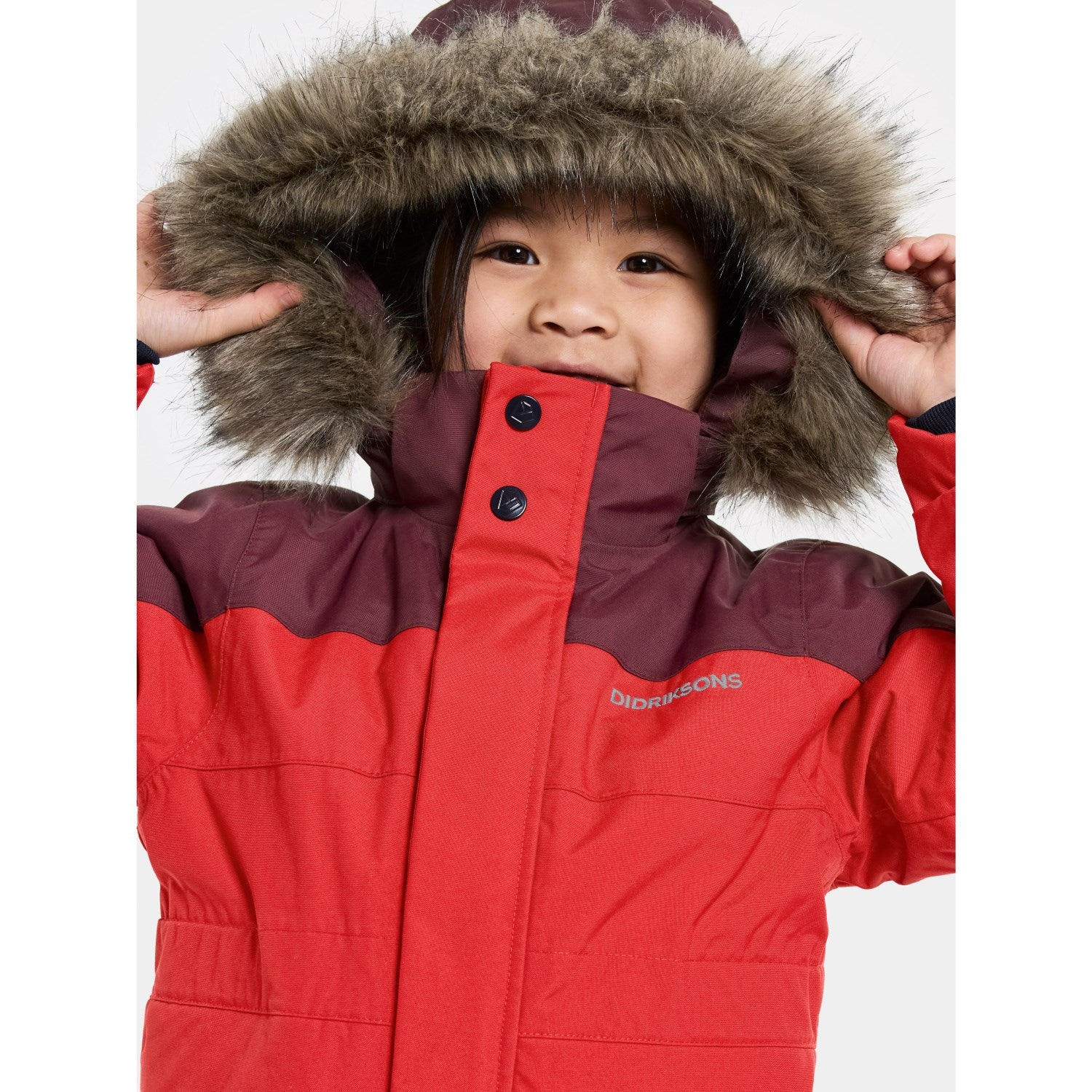 Gled barna med Didriksons Pomme Red Bjärven Kds Cover 4, en robust og stilfull vinterdress perfekt for kalde dager. Denne dressen er designet med tanke på komfort og funksjonalitet, med avtakbar justerbar hette og syntetisk pels. Den har smarte justeringer ved ben og ermer, inkludert fotstropper i silikon og snøgamasjer, som sikrer god passform og holder snøen ute. Pustende stoff med navneetikett og kleshenger på innsiden for enkel tørking gjør dette til et praktisk valg. Reflekterende detaljer sørger for synlighet i mørket. Didriksons' kjente kvalitet og omtanke for detaljer gjør denne vinterdressen til et trygt valg for vinterlek.