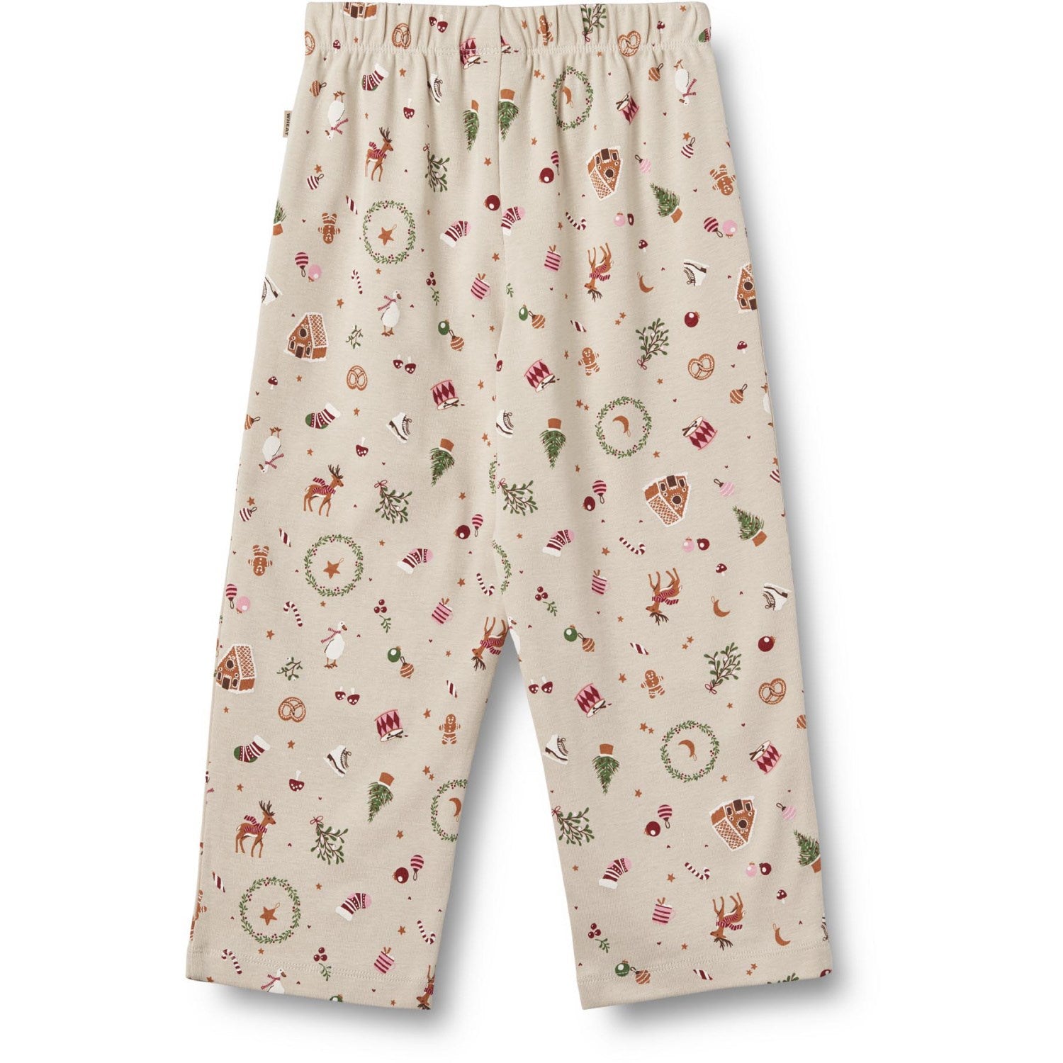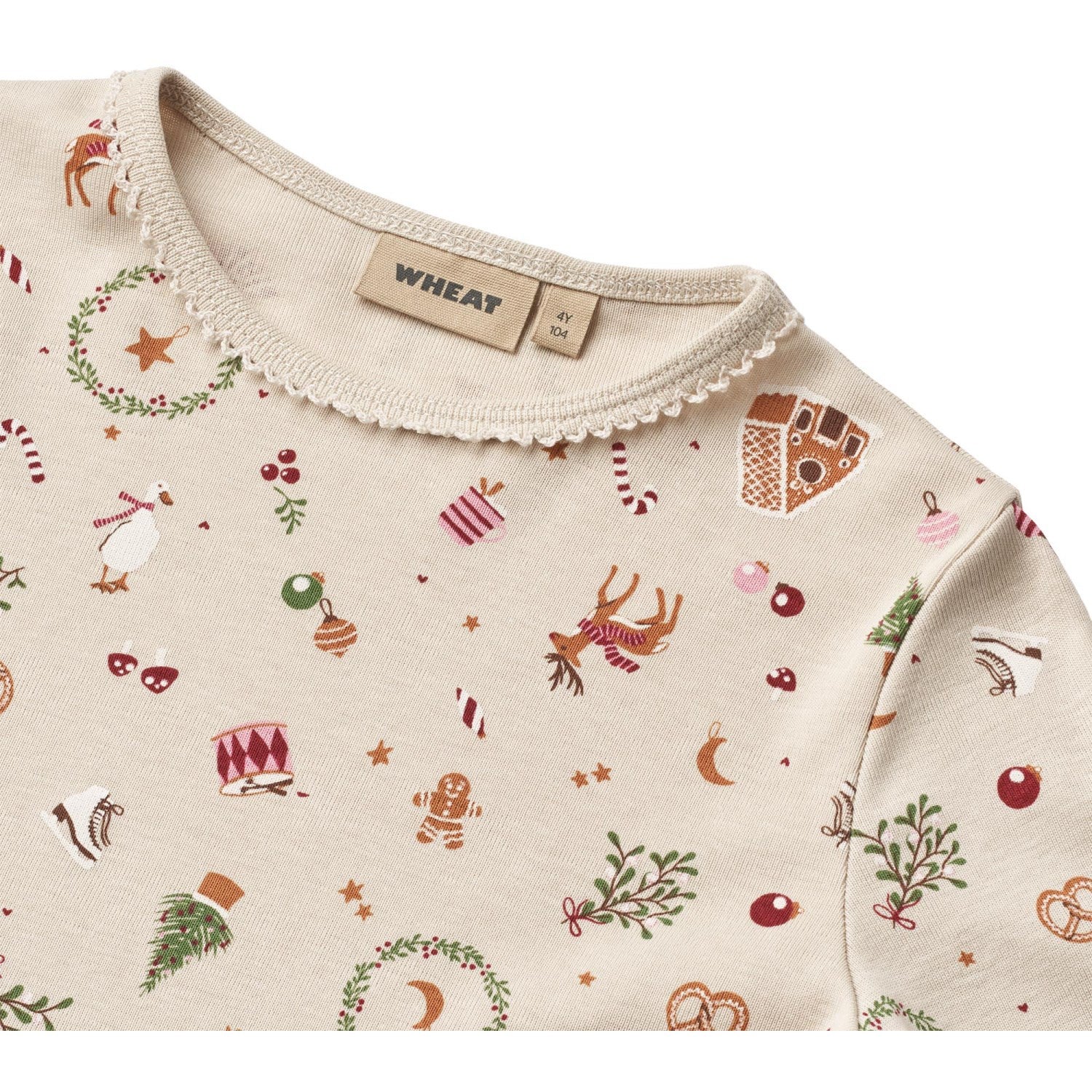 Overdelen av pyjamasen, en langermet T-skjorte, er prydet med fine picoting blondedetaljer i halsen, som gir et snev av eleganse og sødme, mens buksen er utstyrt med en praktisk elastisk midje, som sikrer god passform og enkel påkledning. Wheats signaturtrykk med julemotiver fullfører stilen og vil garantert bringe glede til de minste.