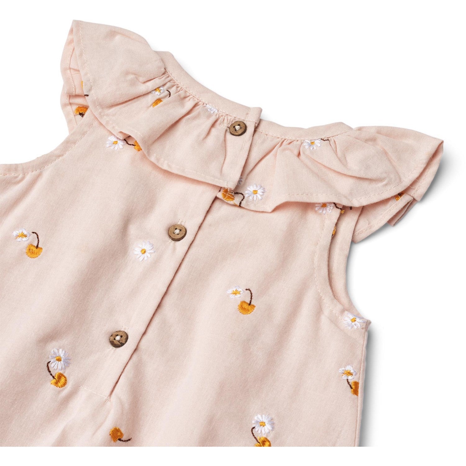 Gå inn i sommeren med stil i Wheat's Powder Yellow Cherries Dress Suit Ingeborg, et sjarmerende ensemble perfekt for den lille! Denne ermeløse dressen er laget av 100 % økologisk bomull, og har herlige volanger rundt halsen og et lunefullt heldekkende broderi av kirsebær. Den er designet med tanke på det praktiske, med en løs passform kombinert med bekvemmeligheten til en bodystocking-bunn. Knappelukking bak og trykknapper i skrittet sørger for enkel påkledning og raske bleieskift. La babyen din utforske i komfort og søthet! Sertifisert miljøvennlig og trygt, det er en solfylt sesongstift for enhver ung garderobe.