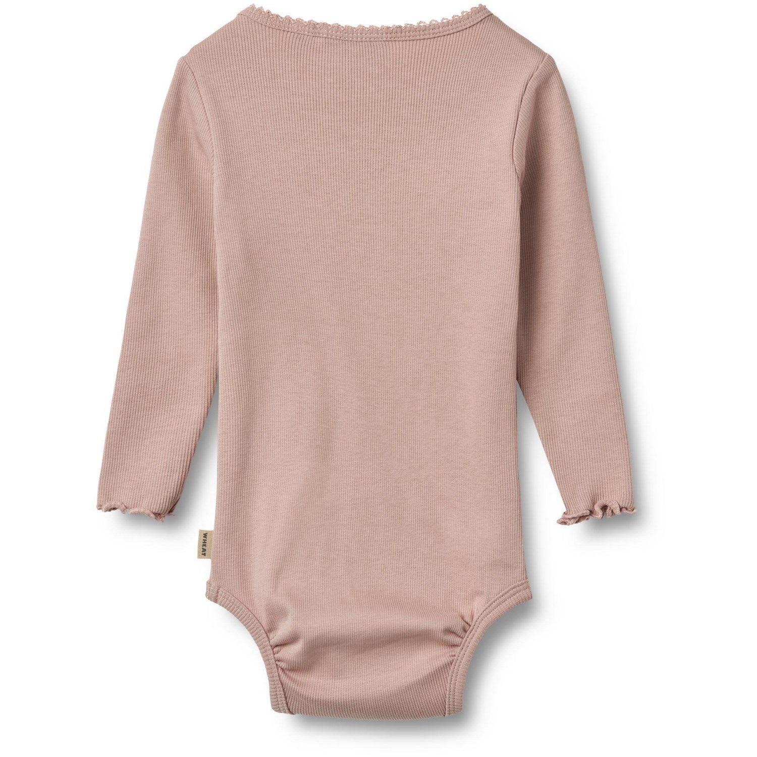 Oppdag varmen og mykheten i vår "Wheat Rose Powder Body L/S Regitze", en langarmet body fremstilt av 95% økologisk bomull og 5% elastan, som sikrer både komfort og holdbarhet. I en delikat rosefarge med sjarmerende detaljer som bomullspicoting og blondekanter rundt halsen, samt volangkanter ved mansjettene, tilbyr denne bodyen en kombinasjon av stil og funksjonalitet. Kroppens ribbestruktur og de praktiske trykknappene ved skulder og skritt, sammen med rynker bak på benkanten, gir en fremragende passform som tilpasser seg babyens bevegelser. Designet for å fungere feilfritt både som et selvstendig plagg og et komfortabelt lag under andre klær, gjør denne GOTS-sertifiserte bodyen til et must i enhver babygarderobe. Det sikre materialet er sertifisert av Standard 100 fra OEKO-TEX®, noe som garanterer at det er fritt for skadelige stoffer - ideal for sensitiv barnehud. Lettstelt og slitesterk, Wheat's body er en investering i både stil og velvære for din lille.