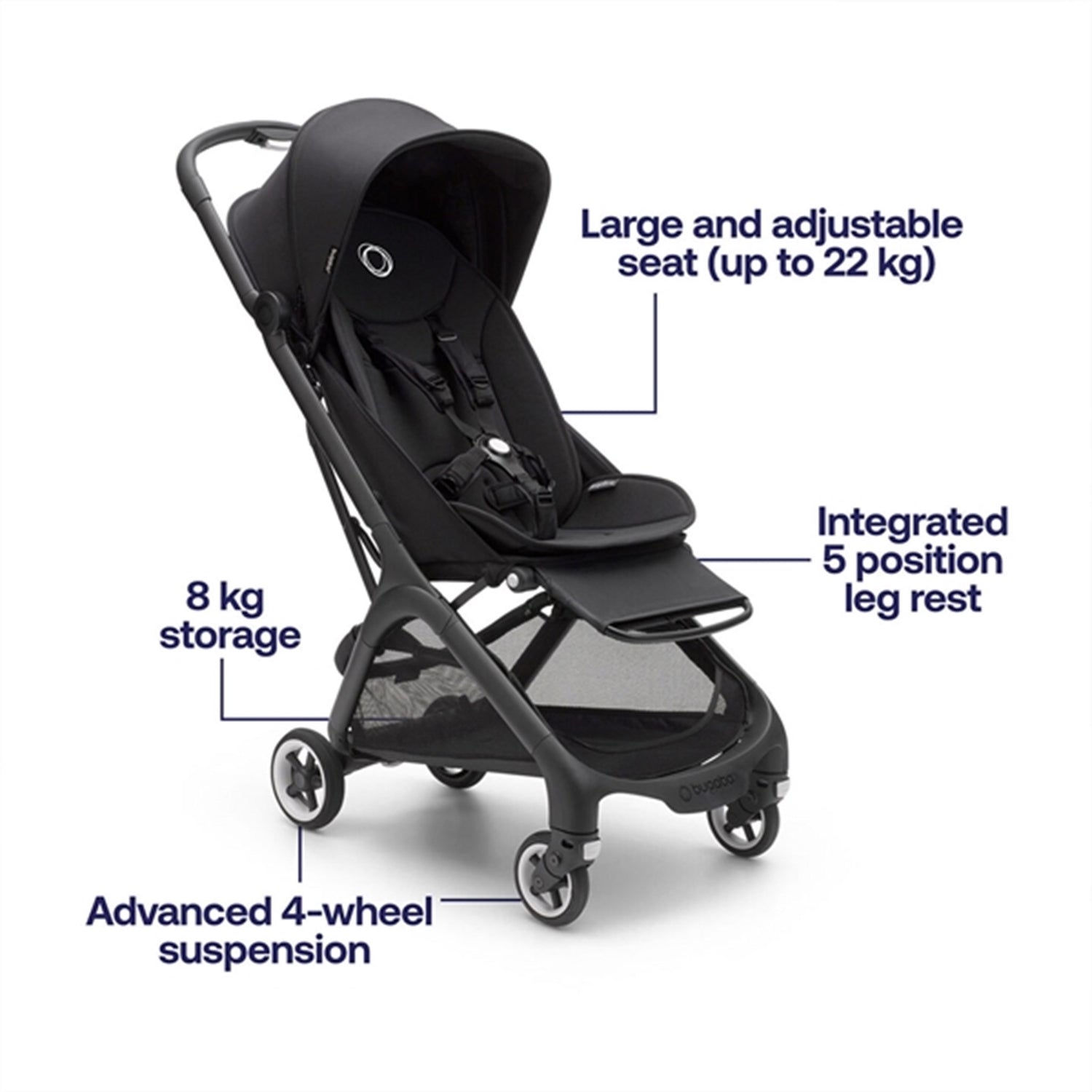 - Liten og lett (7,3 kg), inkludert benstøtte, bærestropp og seteinnsatser