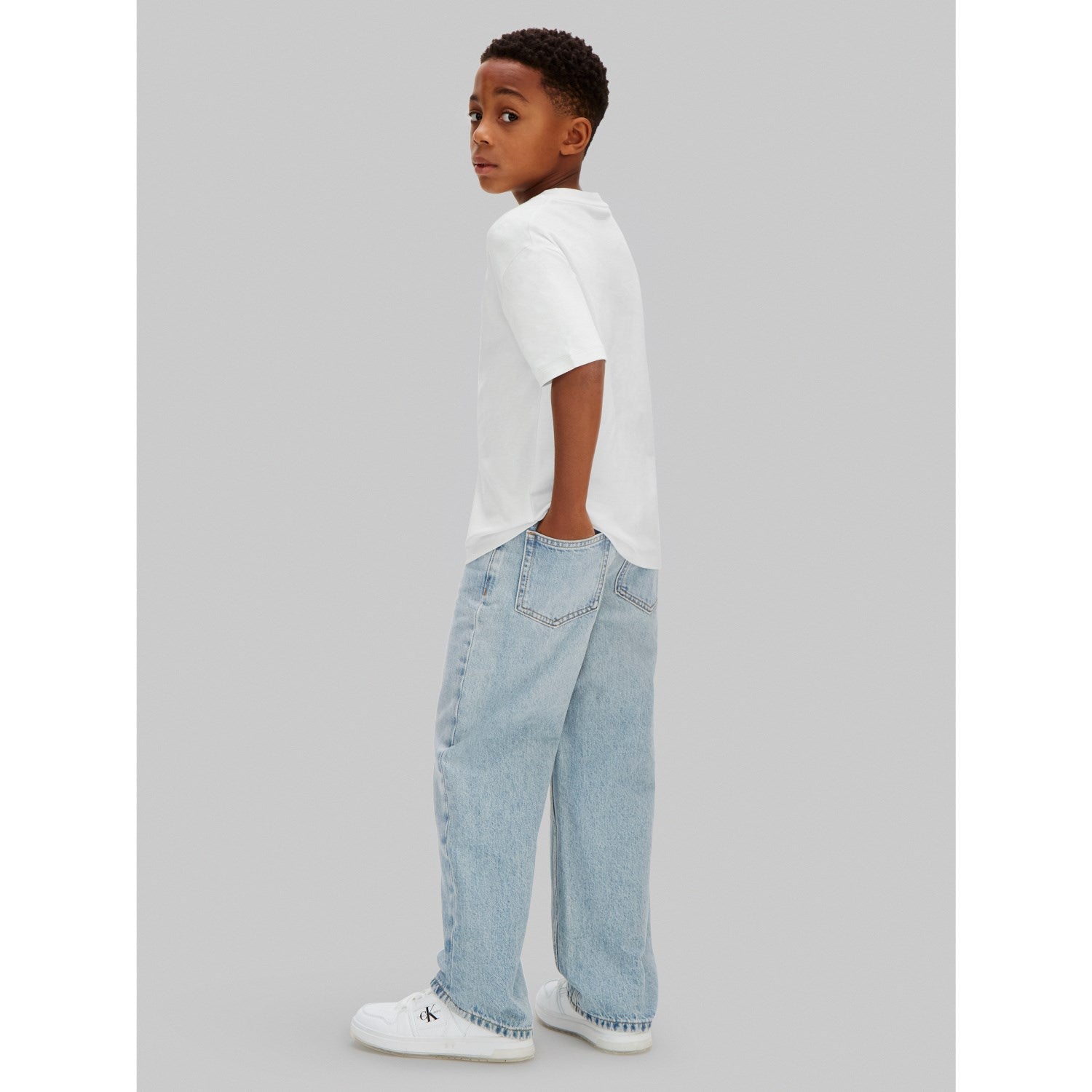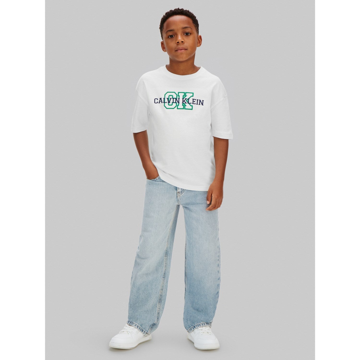 Gi de små et stilig og komfortabelt antrekk med Calvin Klein White Varsity Logo SS T-skjorte. Denne t-skjorten er laget av myk, pustende bomull, perfekt for barnets sensitive hud. Designet er enkelt med et iøynefallende Varsity-logo, og passer utmerket både til hverdagsbruk og spesielle anledninger. T-skjorten kommer i en ren hvit farge og har en avslappet passform som sikrer bevegelsesfrihet for alle slags leker og aktiviteter. Lett å vedlikeholde, dette plagget er en ideell kombinasjon av stil og funksjonalitet for barnegarderoben.