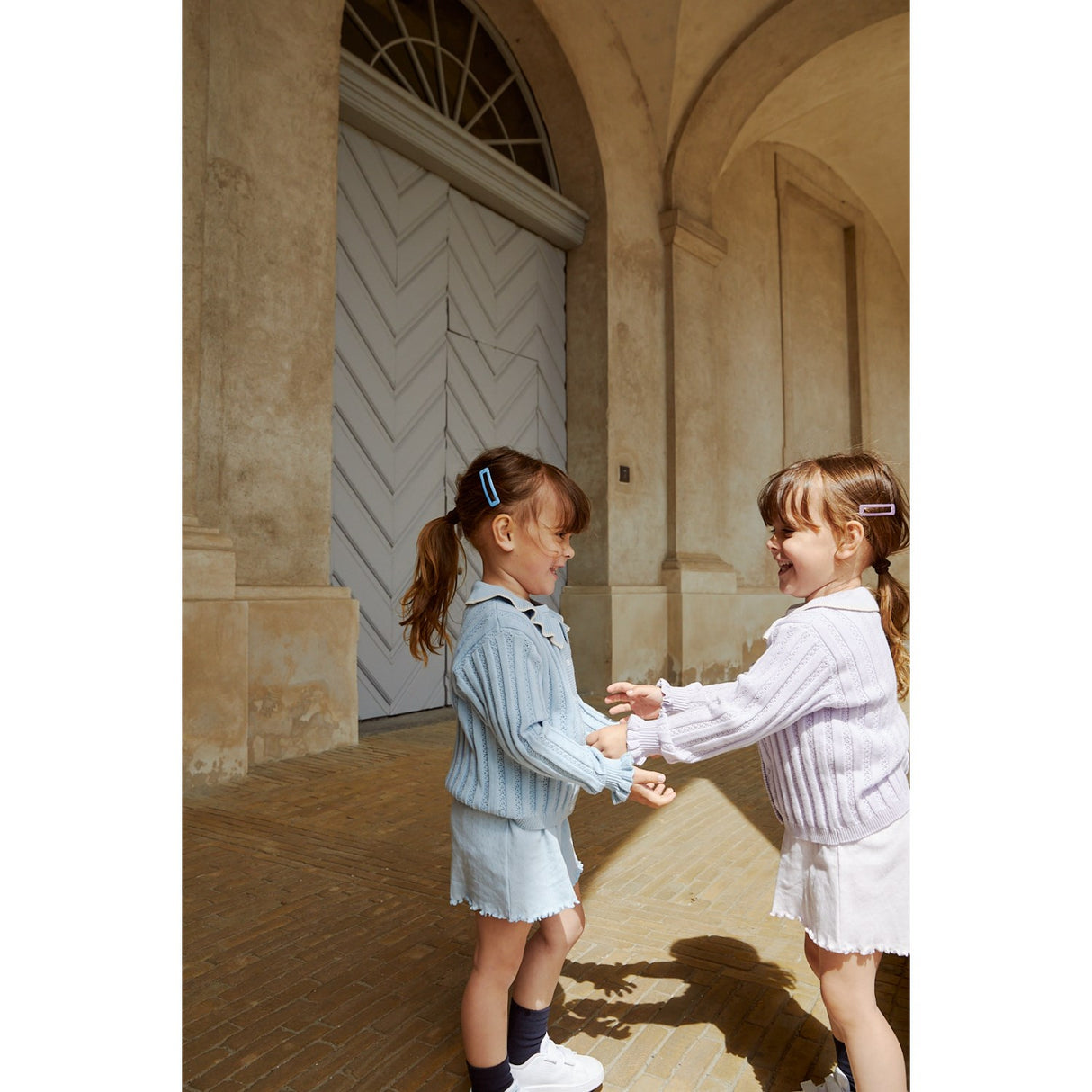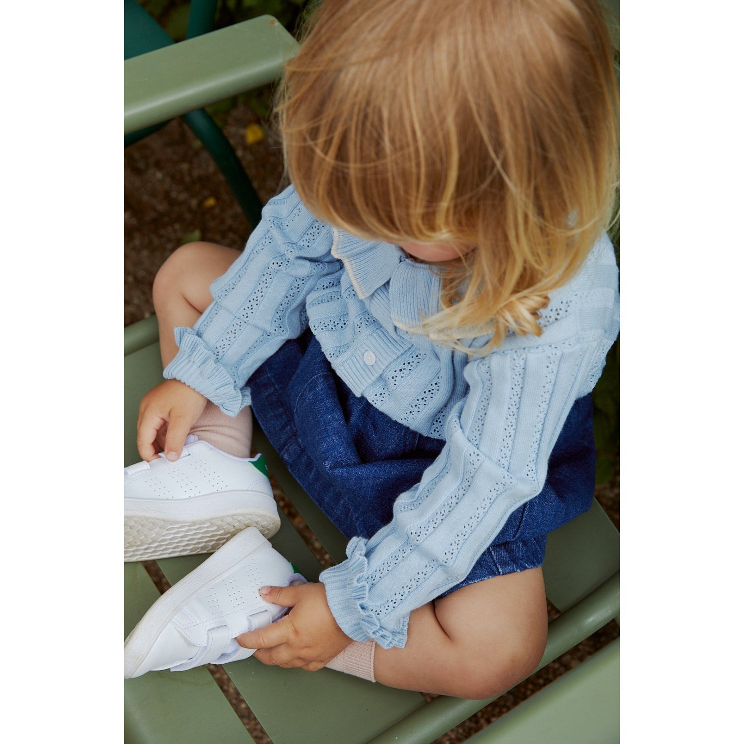 Oppdag vårt nydelige utvalg med Copenhagen Colors' Dusty Blue Pointelle Cardigan med Halsbånd. Denne sjarmerende cardiganen forener klassisk stil med myk komfort, ideell for barnas hverdag. Fremstilt i mykt, pustende materiale som fremmer god luftsirkulasjon, garanterer den en behagelig bruk hele dagen. Det delikate pointellestrikkede mønsteret kombinert med en søt kragedetalj tilfører et feminint og stilfullt preg, mens fargen i støvet blått tilbyr en beroligende estetikk som lett lar seg kombinere med andre plagg. Med praktiske knapper hele veien ned, lar denne cardiganen seg enkelt ta av og på, og passer perfekt over både kjoler og topper. Størrelse og passform er nøye tilpasset for å sikre optimal bevegelsesfrihet, og robuste materialvalg sikrer at cardiganen tåler hyppig bruk og vask. Enten det er en dag i barnehagen eller en familieutflukt, vil denne cardigangen sørge for at ditt barn ser trendy ut samtidig som det føles komfortabelt. Et must i enhver barne garderobe!
