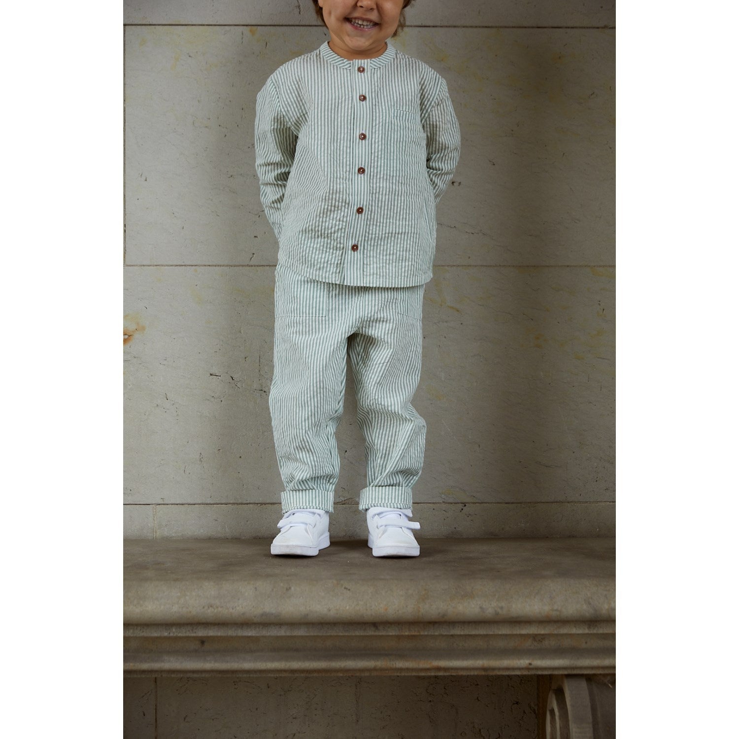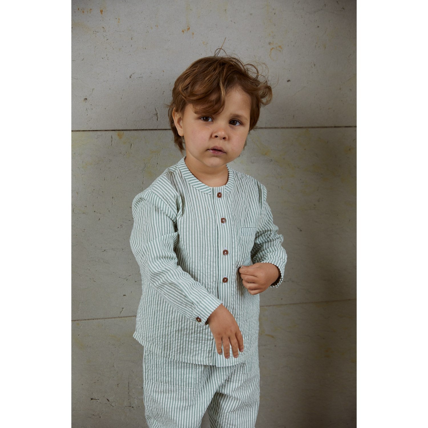 Oppdag vår klassiske, grønne og kremstripede seersucker-skjorte fra Copenhagen Colors, perfekt for den lille trendsetteren. Laget av 100% økologisk bomull, er denne skjorten ikke bare bærekraftig, men også utrolig myk mot huden. Det tidløse stripemønsteret og det luksuriøse stoffet tilfører et snev av sjarm, mens den fleksible konstruksjonen sikrer fri bevegelse for barnet.
