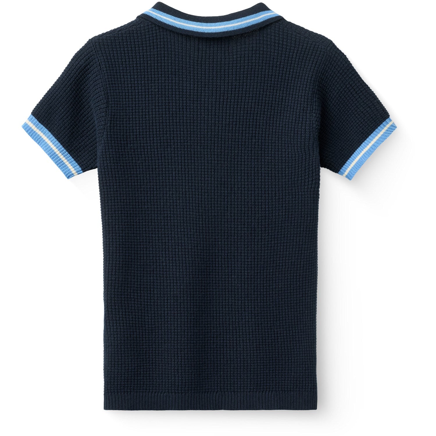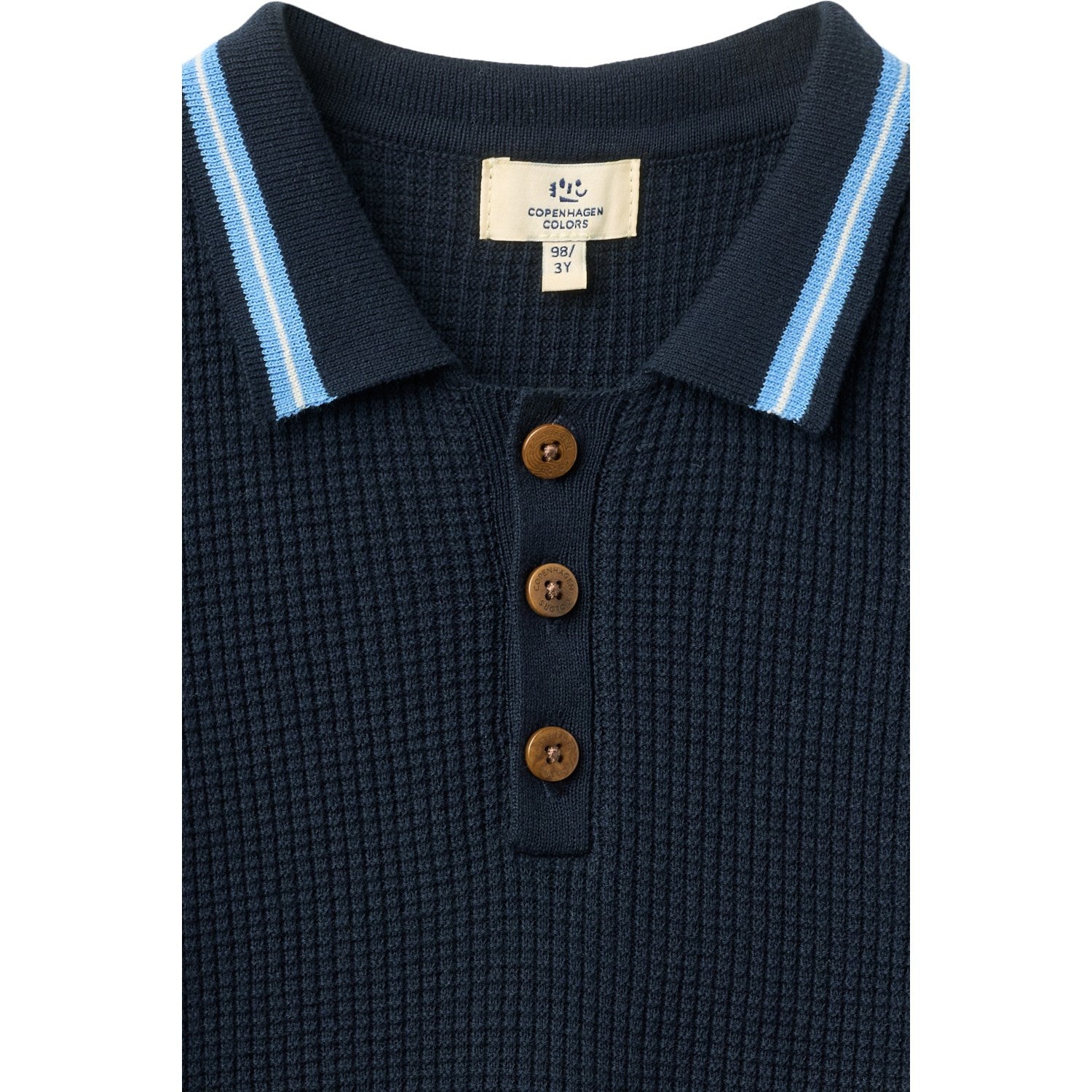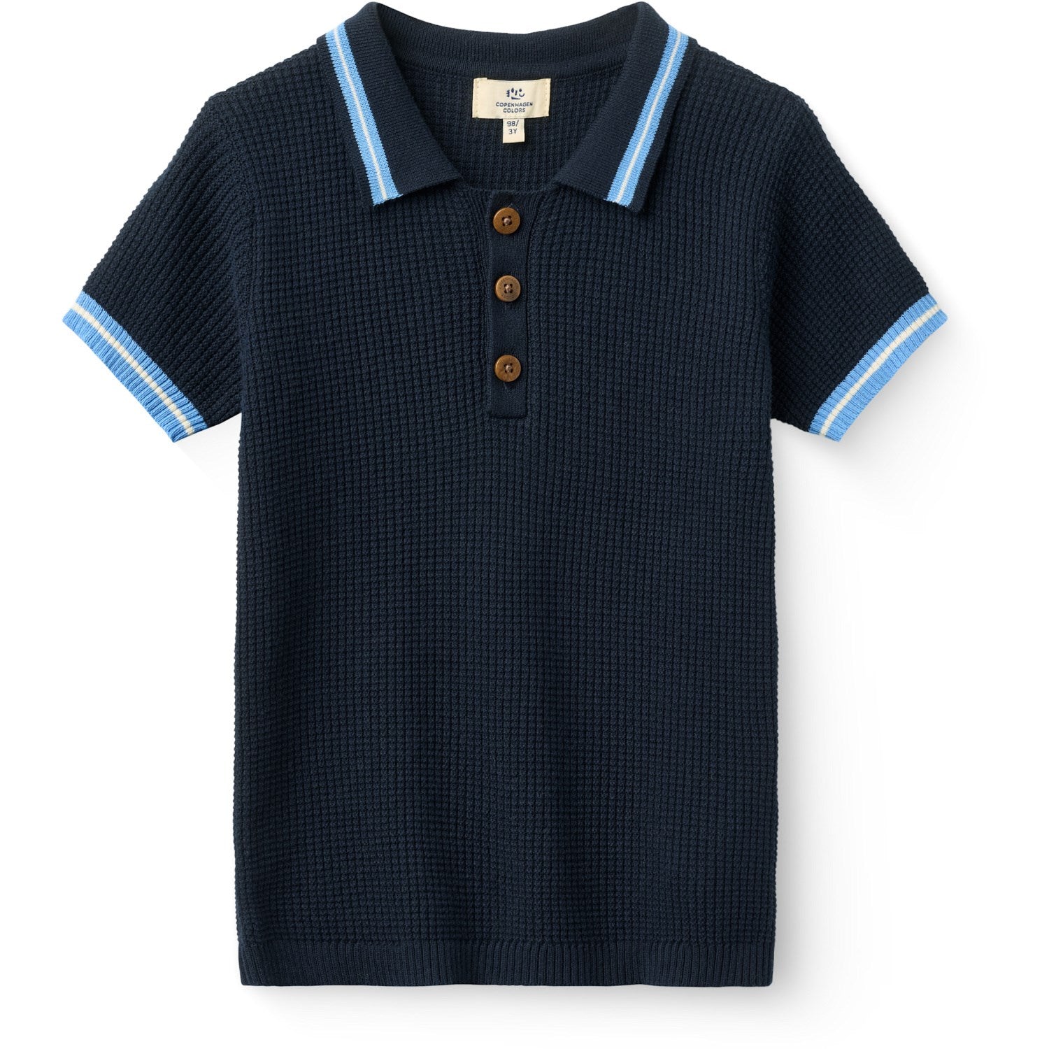 Gi barnet ditt en stilig og behagelig opplevelse med vår kortermede poloskjorte fra COPENHAGEN COLORS. Laget av 100% bomull, sikrer denne poloskjorten både komfort og holdbarhet. Det strikkede mønsteret i en sjenerøs kombinasjon av marineblå, blå og kremfarger tilbyr en frisk visuell appell, mens den klassiske kragen og knaplukkingen sørger for et tidløst preget utseende. Med sin avslappede passform og ribbestrikkede mansjetter, er denne poloen like perfekt til lek som til finere sammenkomster. Lett å ta vare på og ideell for alle sesonger.