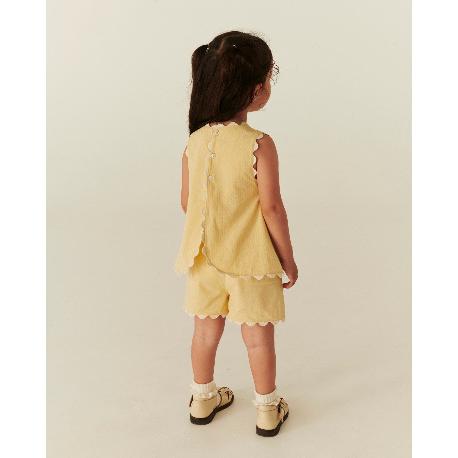 La barnet ditt utforske sommeren med stil i dette shortssettet fra COPENHAGEN COLORS. Settet består av 100 % GOTS-sertifisert bomull, som sikrer en ekstraordinær mykhet og pusteevne. Den ermeløse toppen i lys gul og krem har en avslappet passform med sjarmerende, bølgete kanter, perfekt speilet i de matchende shortsene. Dette sikrer både et friskt utseende og komfort. Praktisk knapplukking bak på toppen letter påkledningen og bidrar til en behagelig brukeropplevelse. Dette allsidige og funksjonelle settet er et ideelt valg for alt fra lek i parken til familieutflukter på varme dager.