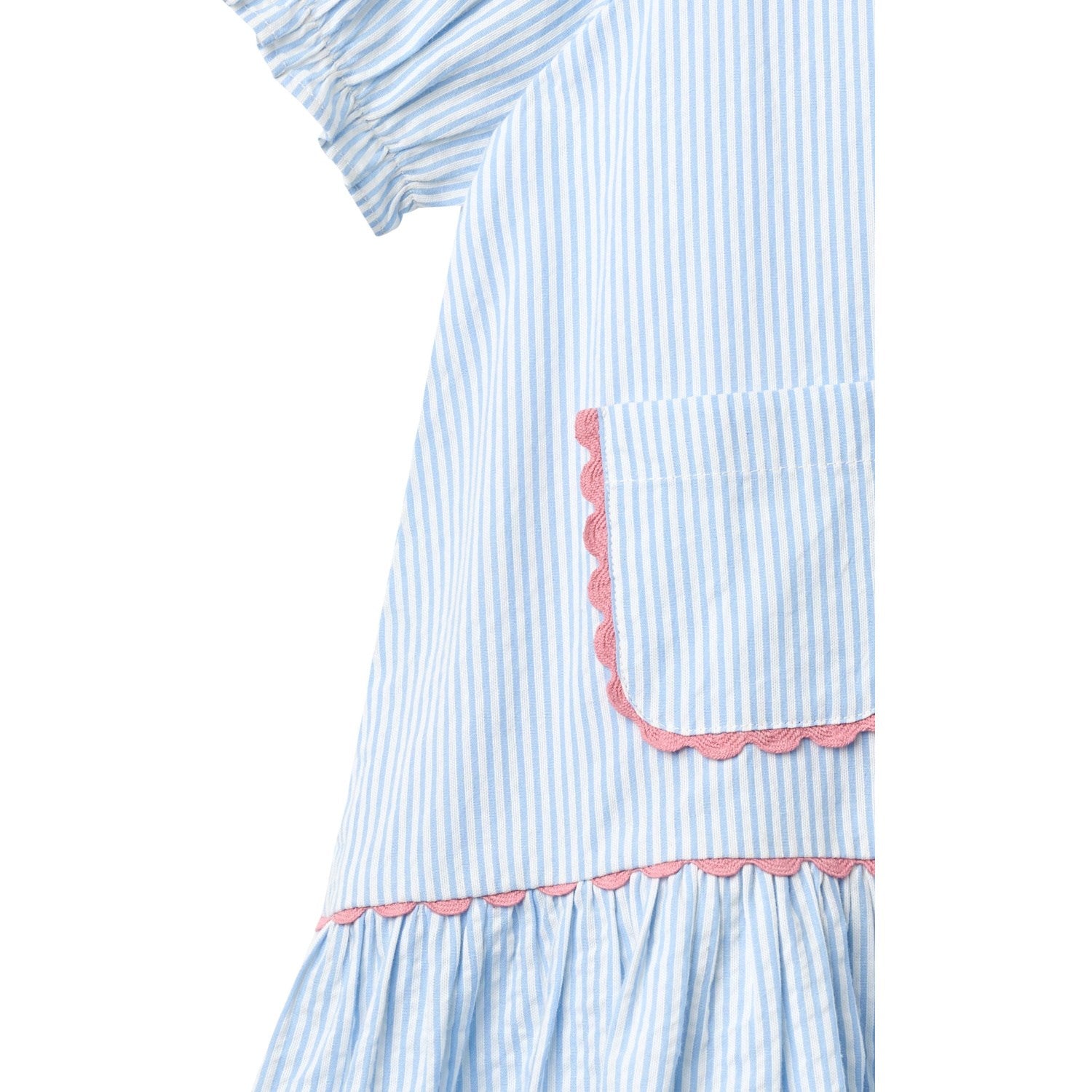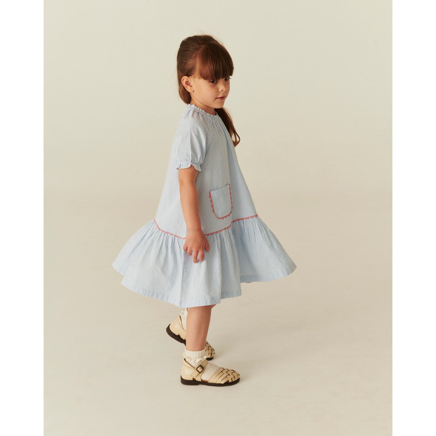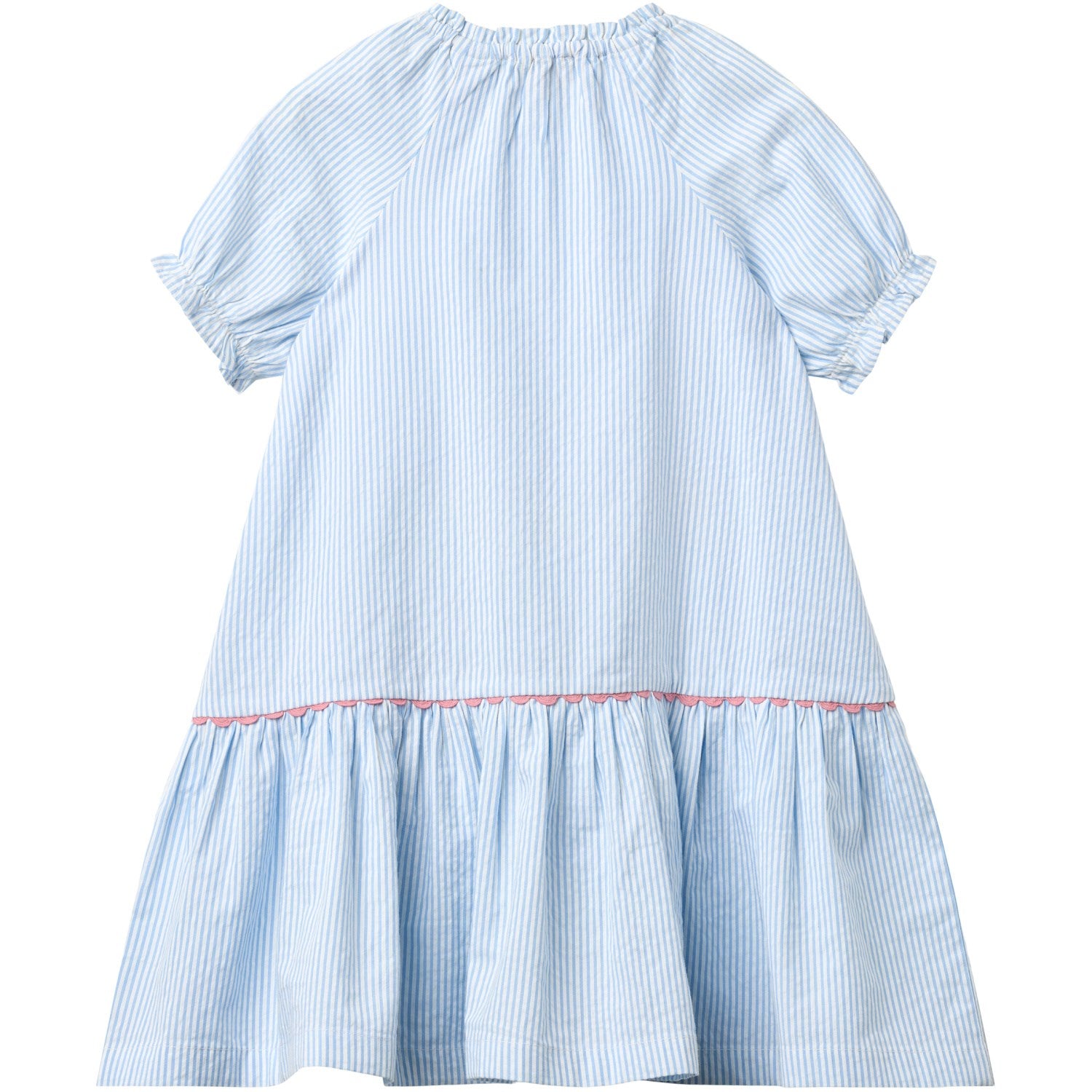 Oppdag den sjarmerende "Copenhagen Colors Sky Blue W Cream Stripe Seersucker kjole". Laget av 100% GOTS-sertifisert økologisk bomull, garanterer denne kjolen både mykhet og pusteevne, ideell for småbarns sensitiv hud. Det tidløse seersucker-stripestoffet i himmelblå med kremfargede striper kombinert med rosa kanter, tilfører et muntert og klassisk preg.