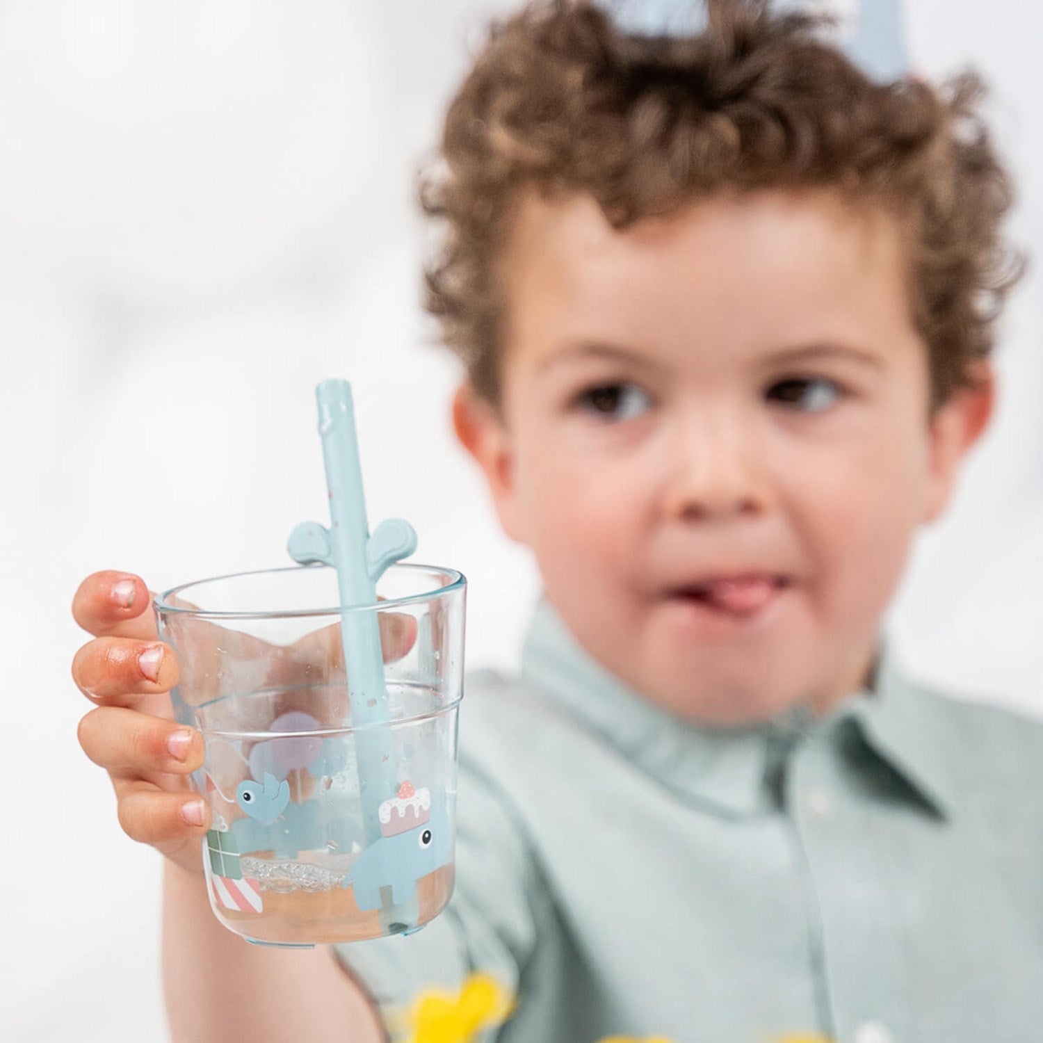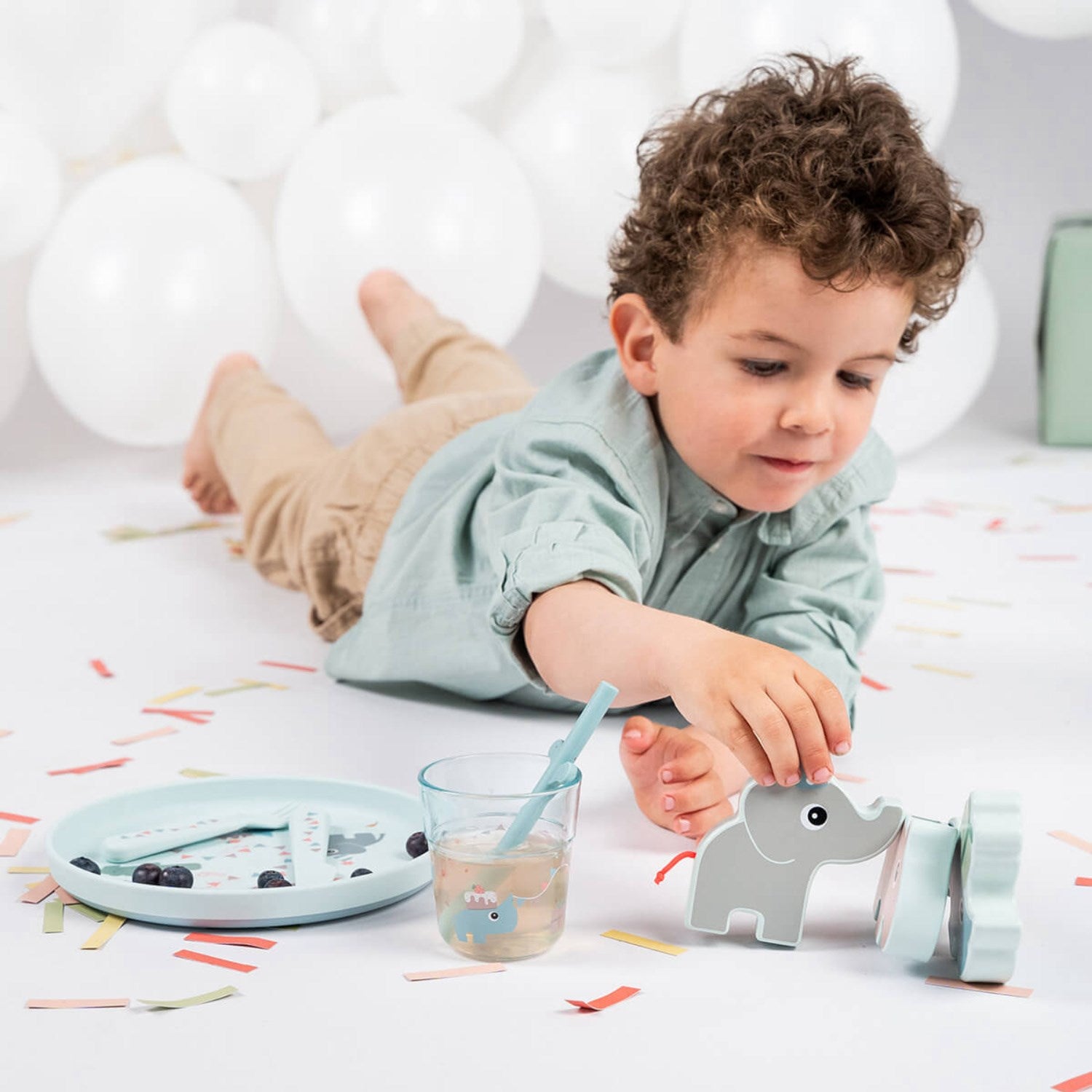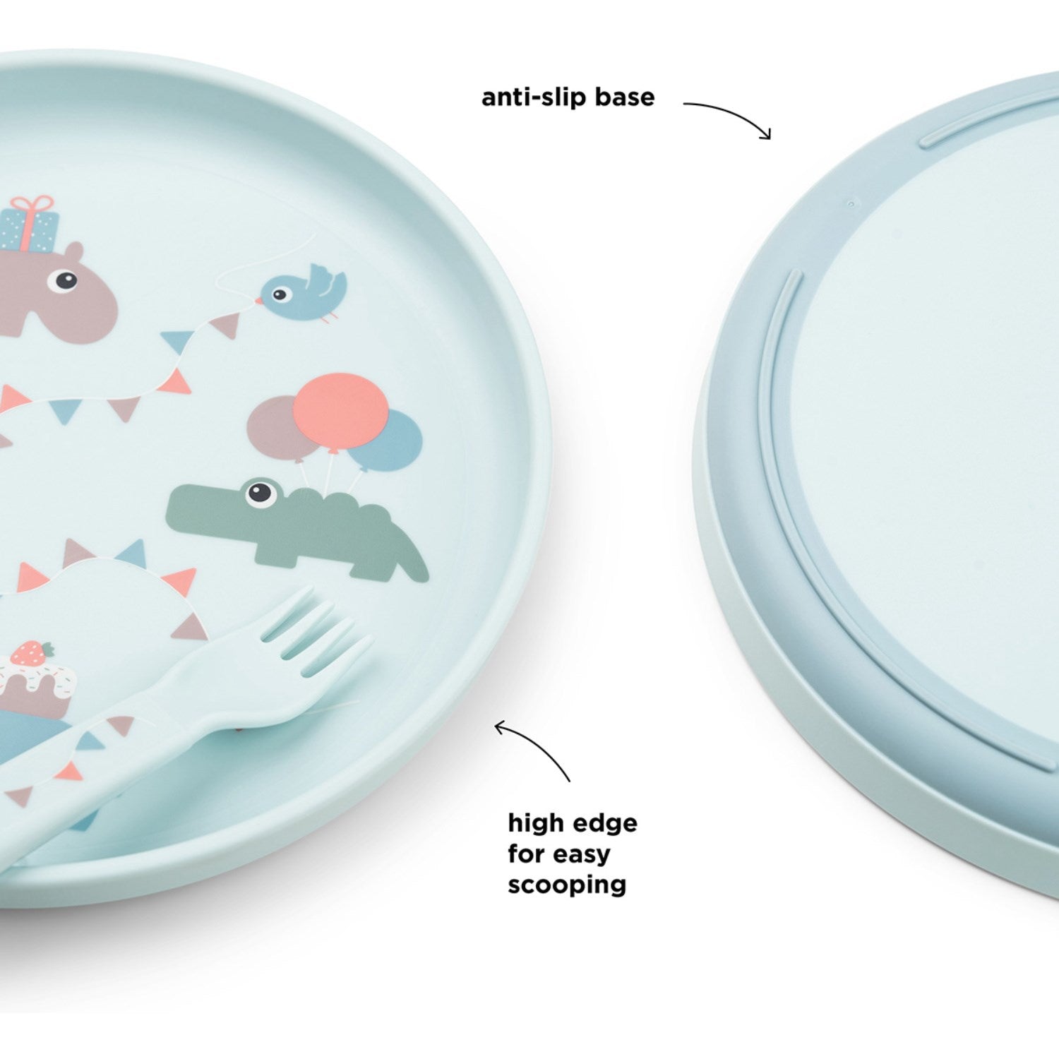 Sikkerhet og brukervennlighet er prioritert med den sklisikre bunnen på tallerkenen som sikrer at måltidene går knirkefritt uten unødige søl. Tallerkenen og bestikket er robuste og holdbare, ideelle for daglig bruk og enkle å vedlikeholde; etter bruk kan disse enkelt rengjøres og sorteres som plast for resirkulering. Målene på delene er praktisk tilpasset småbarns behov: tallerkenen har en diameter på 20 cm med en høyde på 2 cm, mens bestikket måler 12 cm og glasset 7,5 cm i diameter og 8 cm i høyde.
