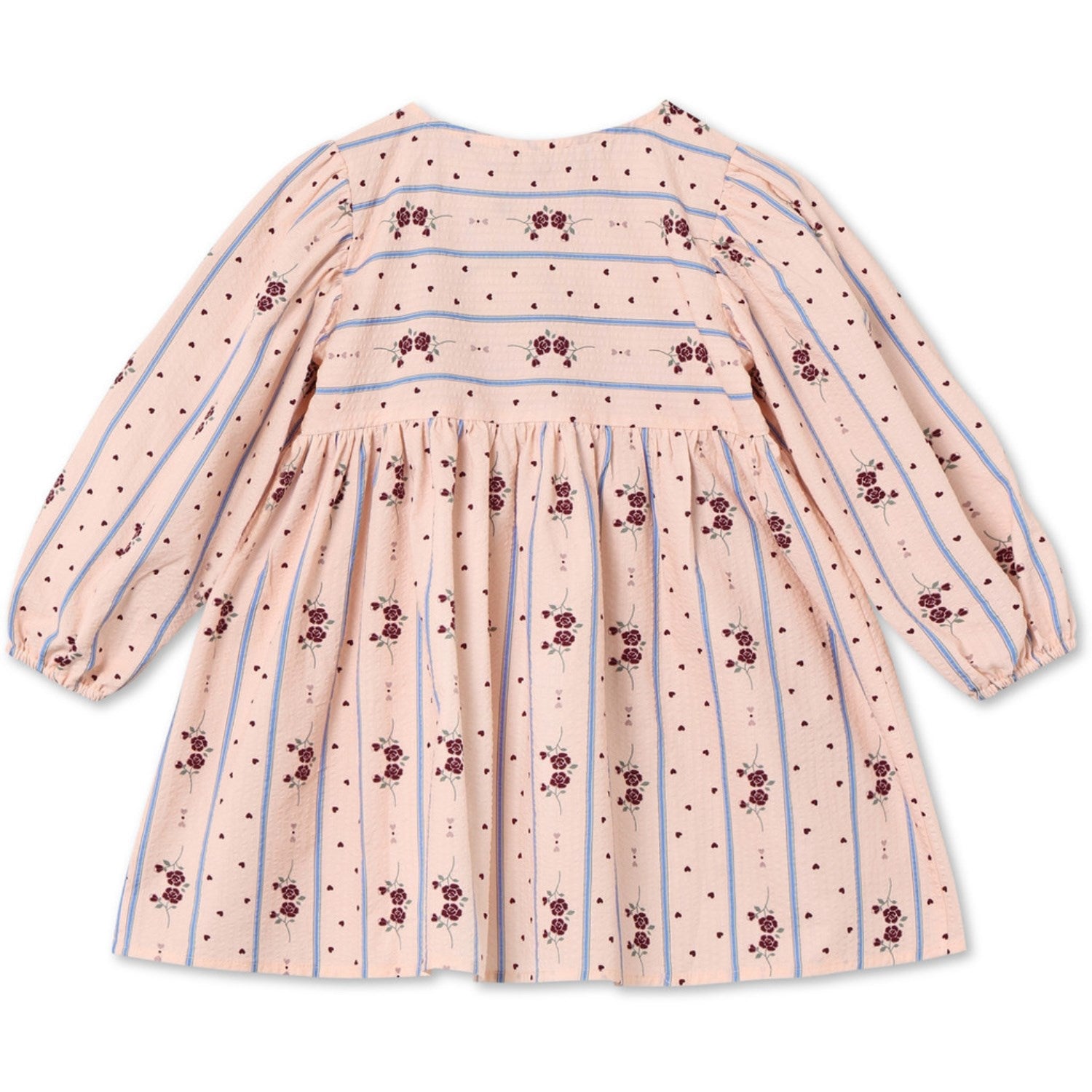 Denne sjarmerende Fliink Chalk Pink Aop Colombe Ls kjolen er perfekt for enhver anledning hvor barnet ønsker å føle seg både komfortabelt og stilig. Laget av 100 % bomull, sikrer denne kjolen suveren mykhet og en behagelig passform for lekne dager. Det iøynefallende mønsteret med roser, hjerter og blå striper, sammen med de dekorative sløyfene på brystet, tilfører et lekent og feminint uttrykk. Kjolen har praktiske knapper bak for enkel påkledning og er ideell for daglig bruk takket være sin slitesterke kvalitet og enkle vedlikehold - maskinvask ved 30°C på delikat syklus. En allsidig tillegg til enhver garderobe som vil holde barnet både komfortabelt og stilfullt gjennom sesongene.