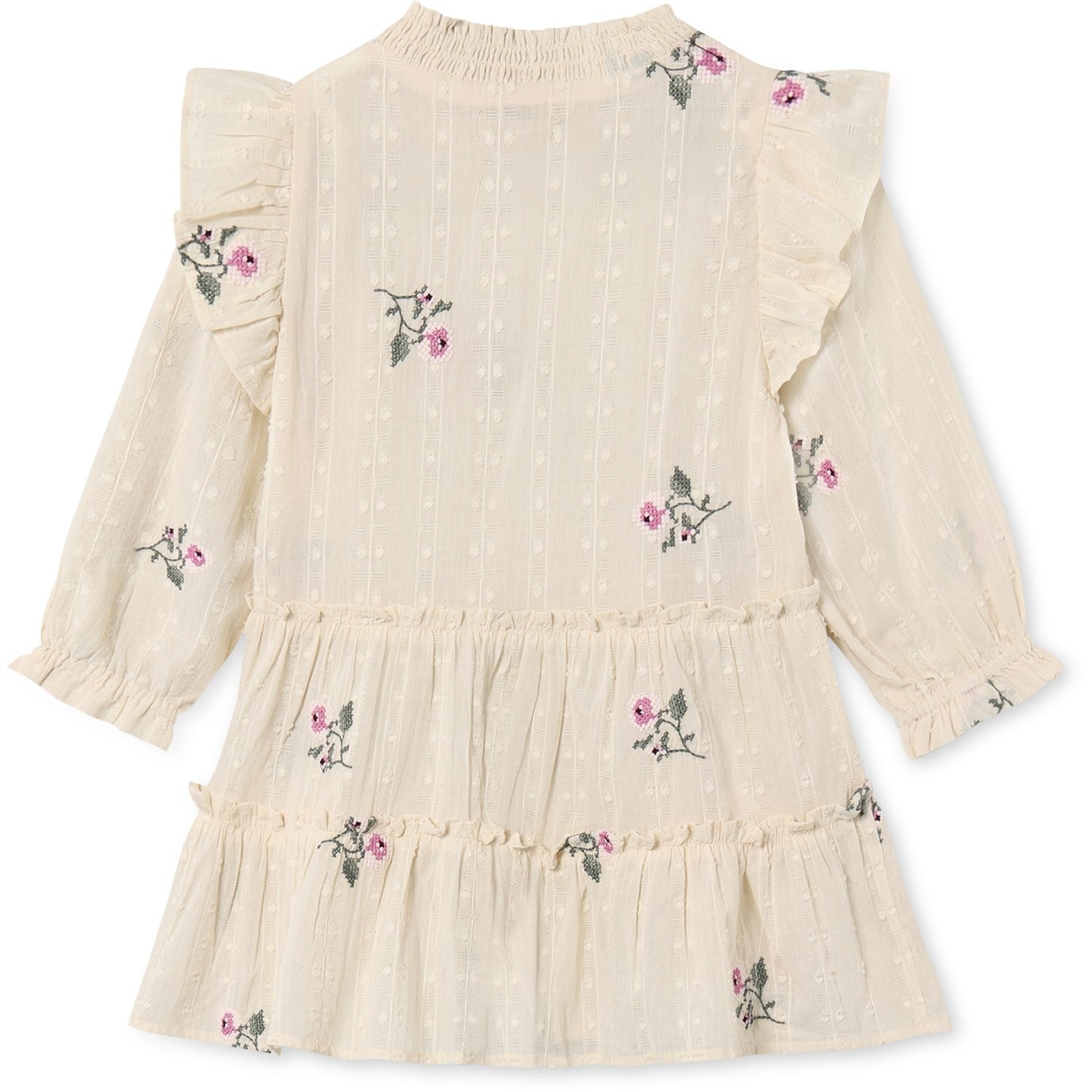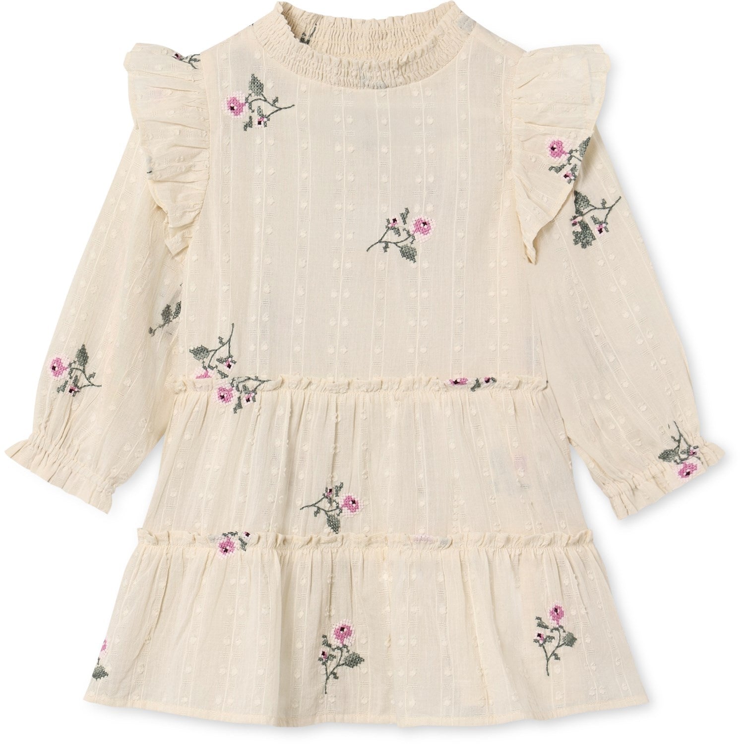Oppdag den nydelige "Fliink Sandshell Dobby Ls Rose Embr Kjole" - perfekt for enhver spesiell anledning for din lille prinsesse. Denne sjarmerende langermede kjolen er laget av 100% myk vevd bomull, beriket med delikate broderte roser som tilfører et touch av eleganse. Designet inkluderer puffermer med elastiske mansjetter og romantiske volanger på skuldrene, noe som skaper et klassisk og stilfullt uttrykk.