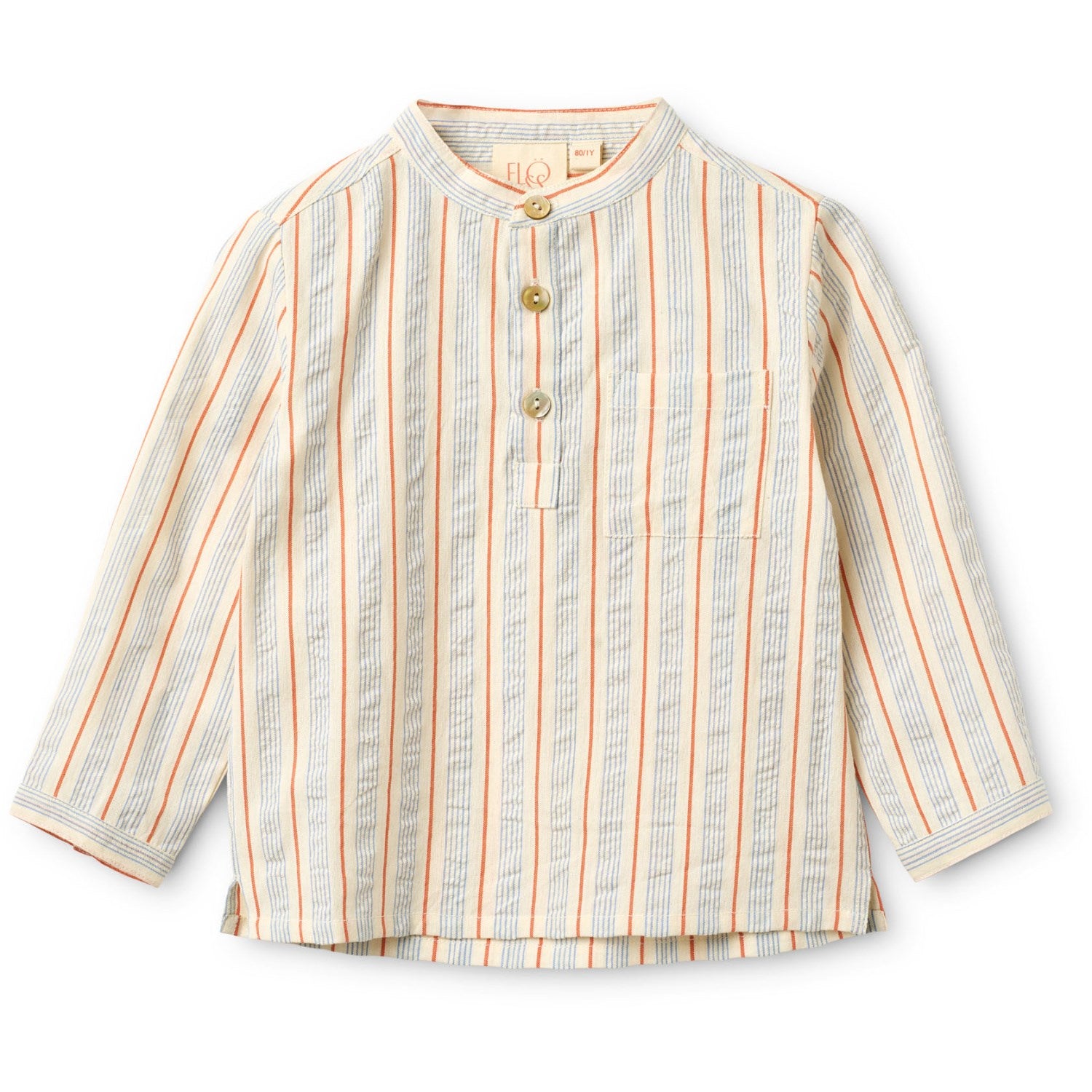 Gi barnet ditt glede av komfort og stil med Robin-skjorten i blått og tangerine stripemønster. Denne sjarmerende genseren er fremstilt i myk bomull og utstyrt med en rund hals og båndkrage for en behagelig passform. Detaljer som brystlomme og perlemorknapper tilfører et elegant preg. Perfekt for både hverdagsbruk og spesielle anledninger, og kan enkelt vaskes i maskin.