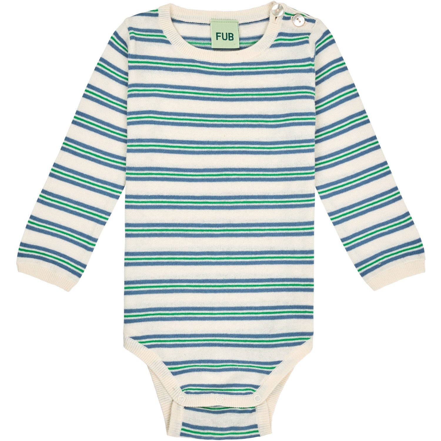 Oppdag vår sjarmerende stripete babybody fra FUB, perfekt for din lille skatt. Denne myke bodyen er laget av 100 % sertifisert økologisk bomull, noe som forsikrer at klærne er fri for skadelige kjemikalier. Med et tidløst design i ecru og washed indigo, lange ermer og klassisk rund hals gir den en stilfull look. Bodyen har praktiske perleskallknapper ved skulderen og trykknapper i skrittet for enkel klesskift. Strikkede garnfargede striper fullfører det elegante utseendet, samtidig som den er behagelig og holdbar for alle babyens eventyr.