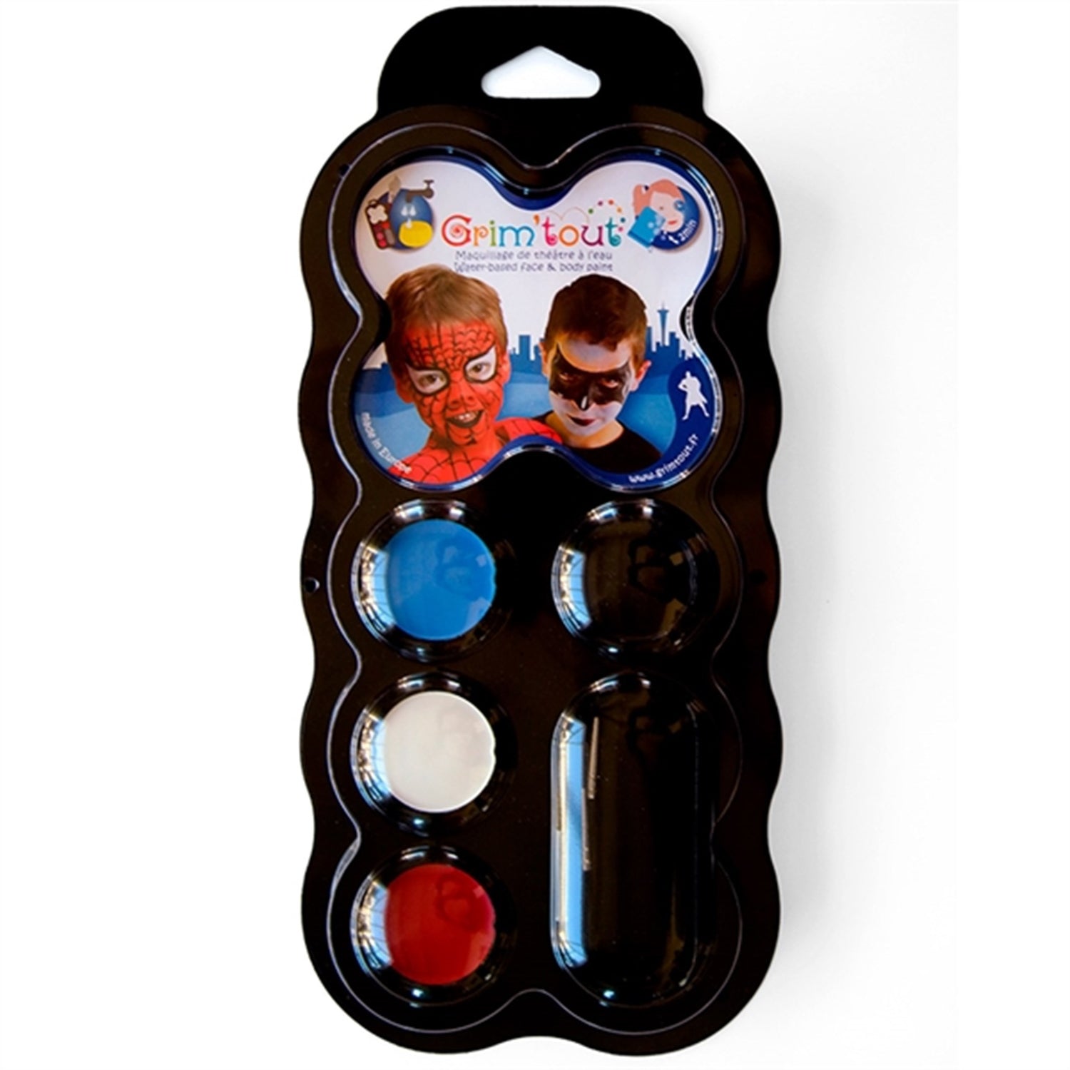Morsom teatralsk sminke/sminke med 4 farger. Ideell for Halloween, fastelavn eller en annen morsom barnebursdag. Pakken inneholder 4 farger, 2 små børster, 1 påføringsspar. Inviterer til morsom lek og rollelek. Kan enkelt vaskes av ansikt og klær med varmt vann.