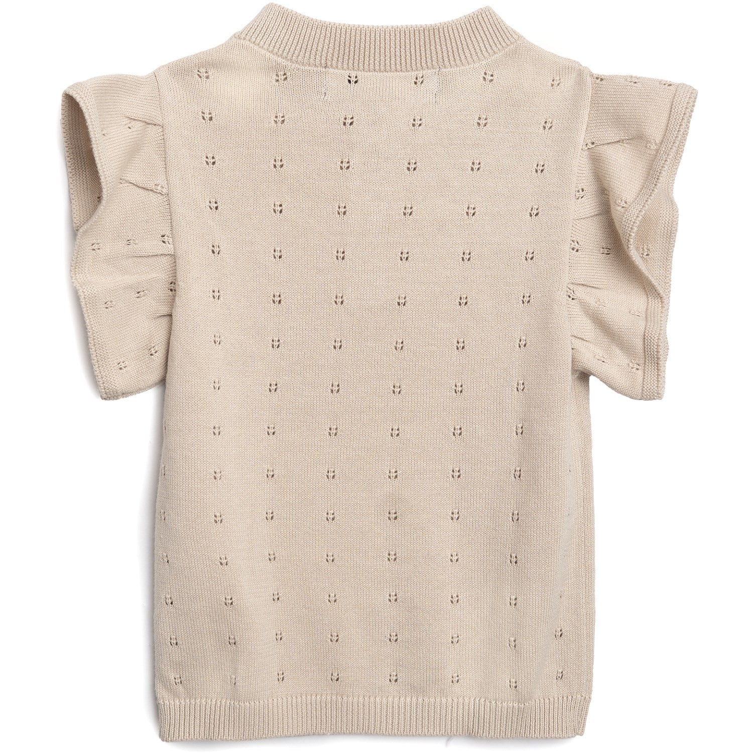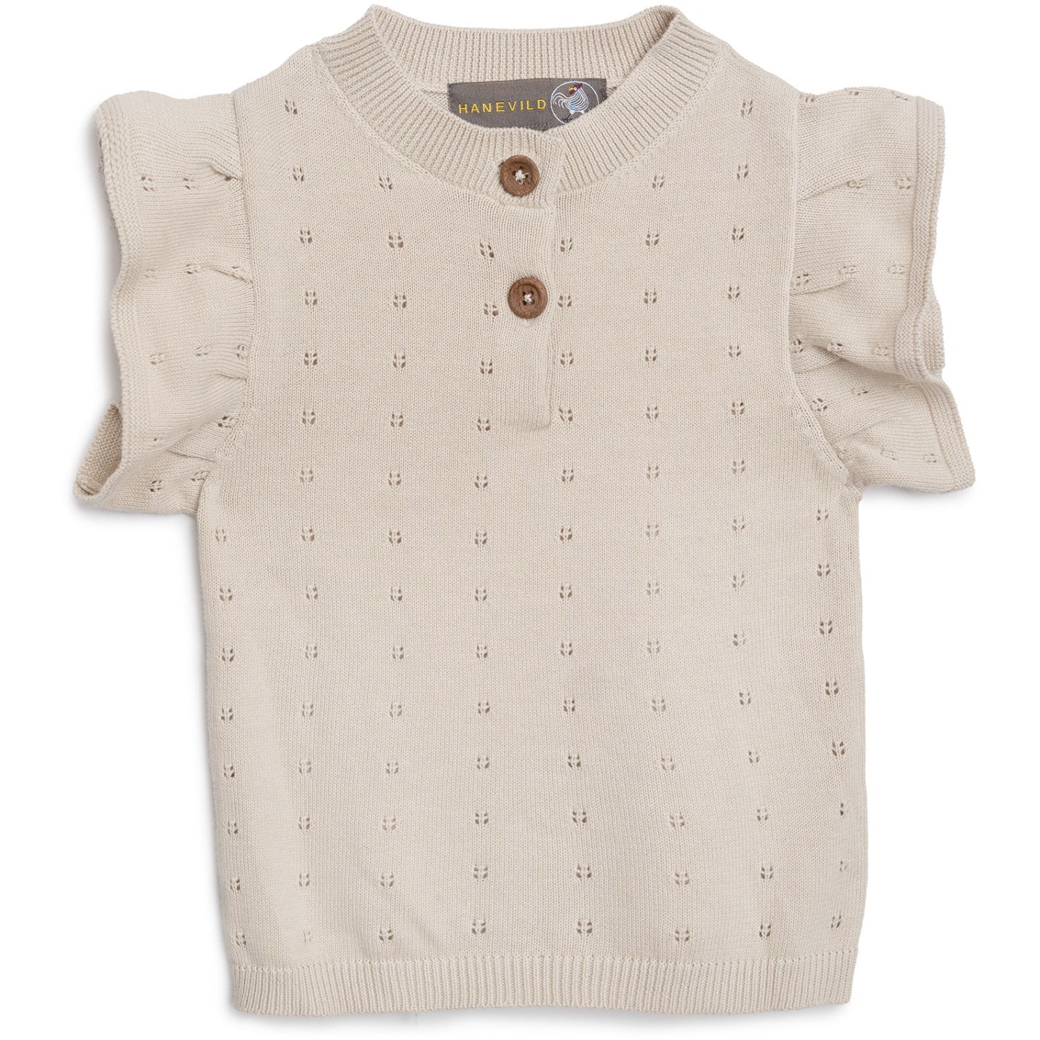 Oppdag den sjarmerende Hanevild Summer Sand Rie Vest, perfekt tilkomst for enhver barnegarderobe! Denne komfortable, ermeløse strikkvesten er fremstilt av 100 % økologisk bomull, noe som sikrer mykhet mot barnets hud. Den stilige, lys beige fargen komplementeres av et unikt maljemønster, som tilfører en subtil, dekorativ tekstur. Designet inkluderer praktiske treknapper foran og en delikat rysjet detalj ved ermene, som tilfører et feminint touch. Vask vesten trygt i maskin på 30°C og tørk den flatt for å bevare form og kvalitet. Et allsidig plagg som kan brukes både som et lag på kjøligere dager eller alene når solen skinner.