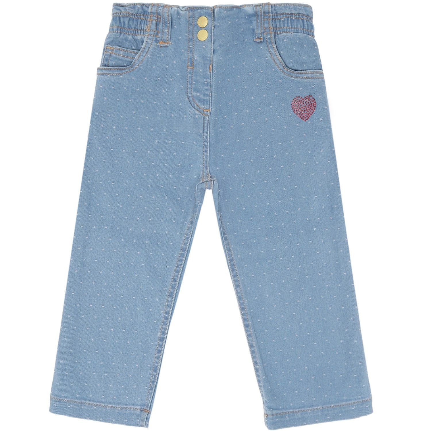 Oppdag våre Hust & Claire Blue Denim "Theresa Dotty" jeans - perfekt for barn som elsker å utforske! Disse jeansene er laget av slitesterk bomull og har et sjarmerende prikkemønster. Den behagelige passformen og justerbare midjen sikrer at barnet ditt kan leke og bevege seg fritt. Det tidløse designet gjør dem ideelle til både hverdagsbruk og spesielle anledninger. Lett å vedlikeholde, disse jeansene er en praktisk og stilig tilføyelse til enhver barngarderobe.