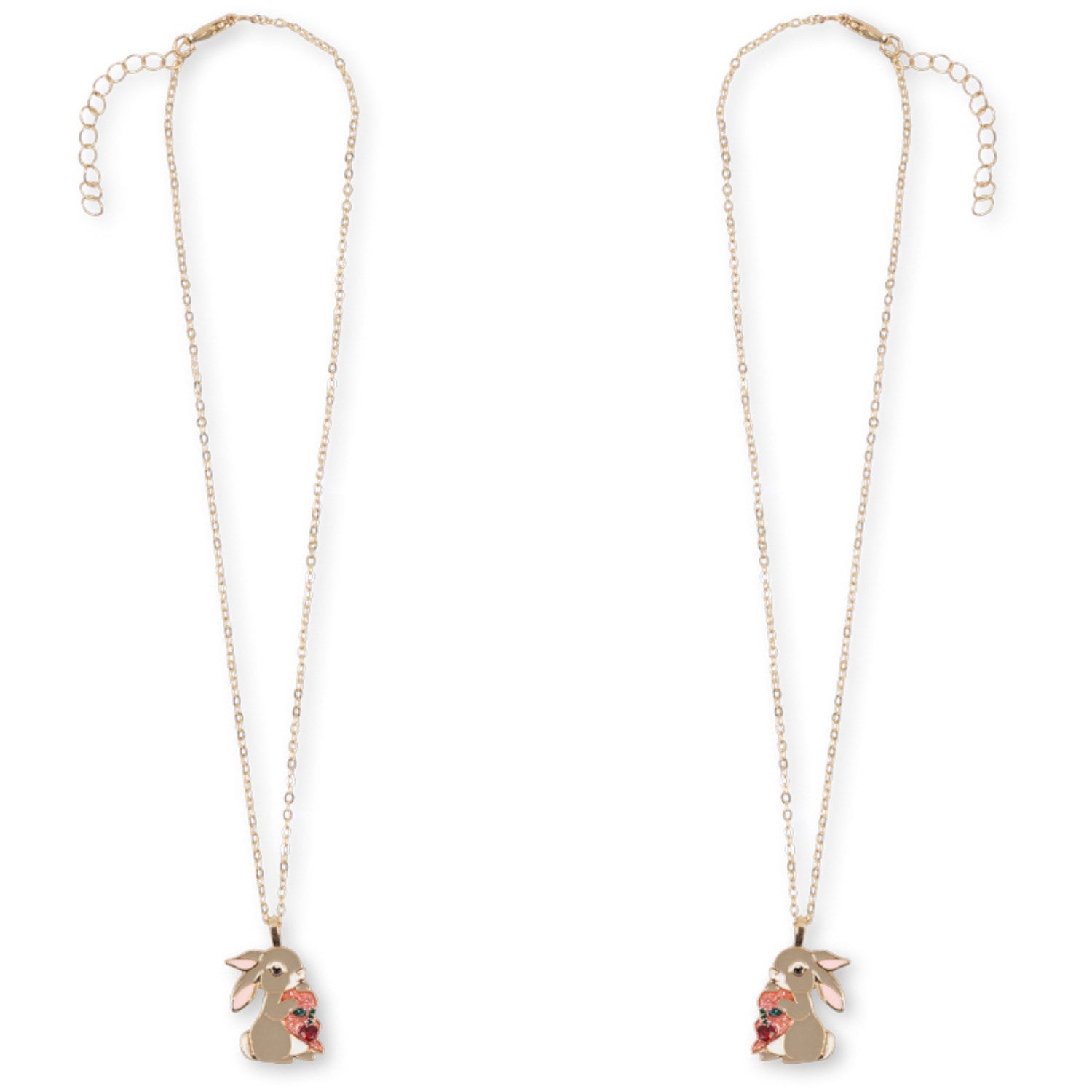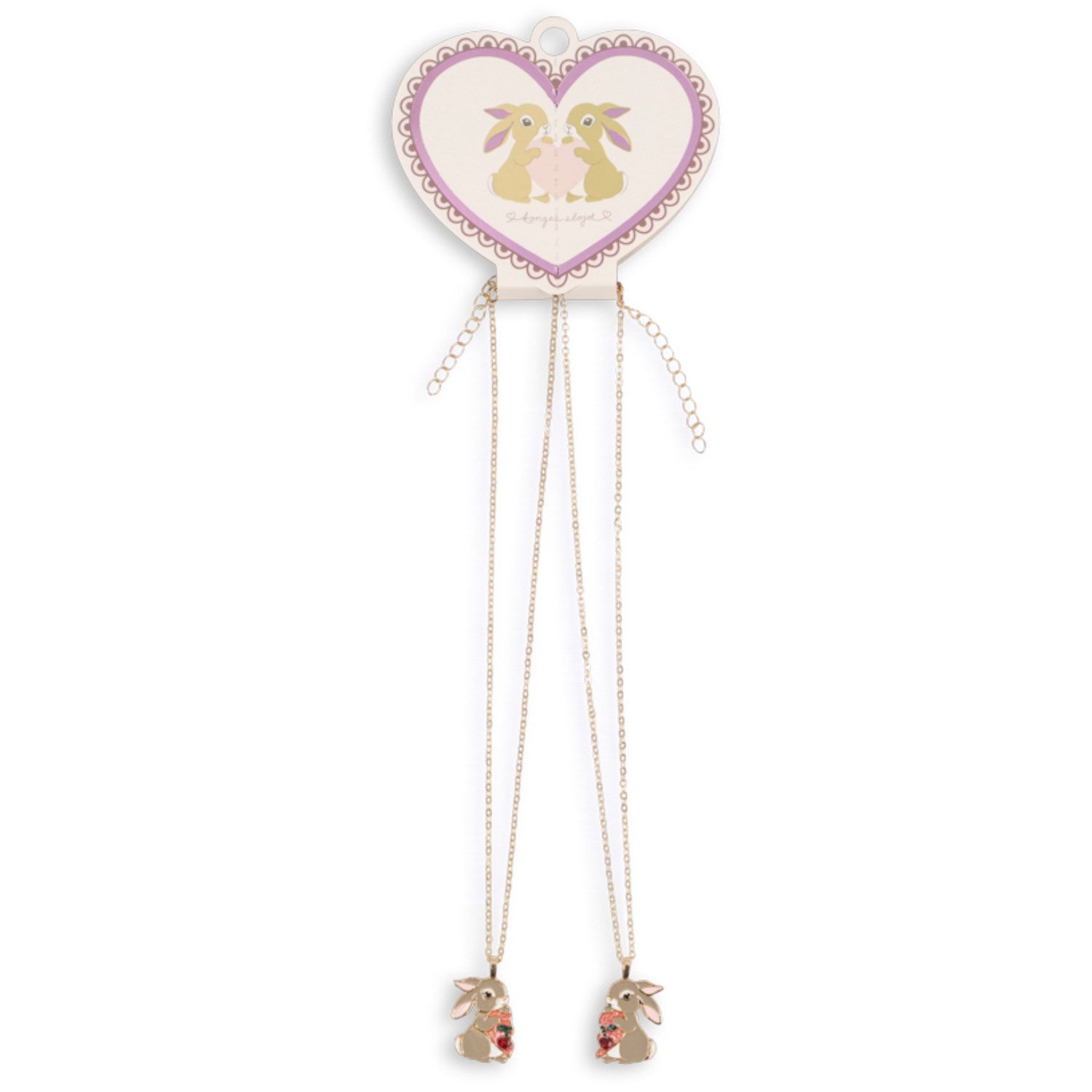 Gled dere til å dele et spesielt øyeblikk med Konges Sløjd Gold Bunny Bestie Necklace-settet! Disse to sjarmerende halskjedene, designet for å deles mellom bestevenner, er 100 % nikkelfrie for trygg bruk. Den søte kaninformen og delikate utførelsen gjør dette til en ideell gave for barn fra 3 år og oppover. Husk å passe på lange ledninger og små deler under lek.