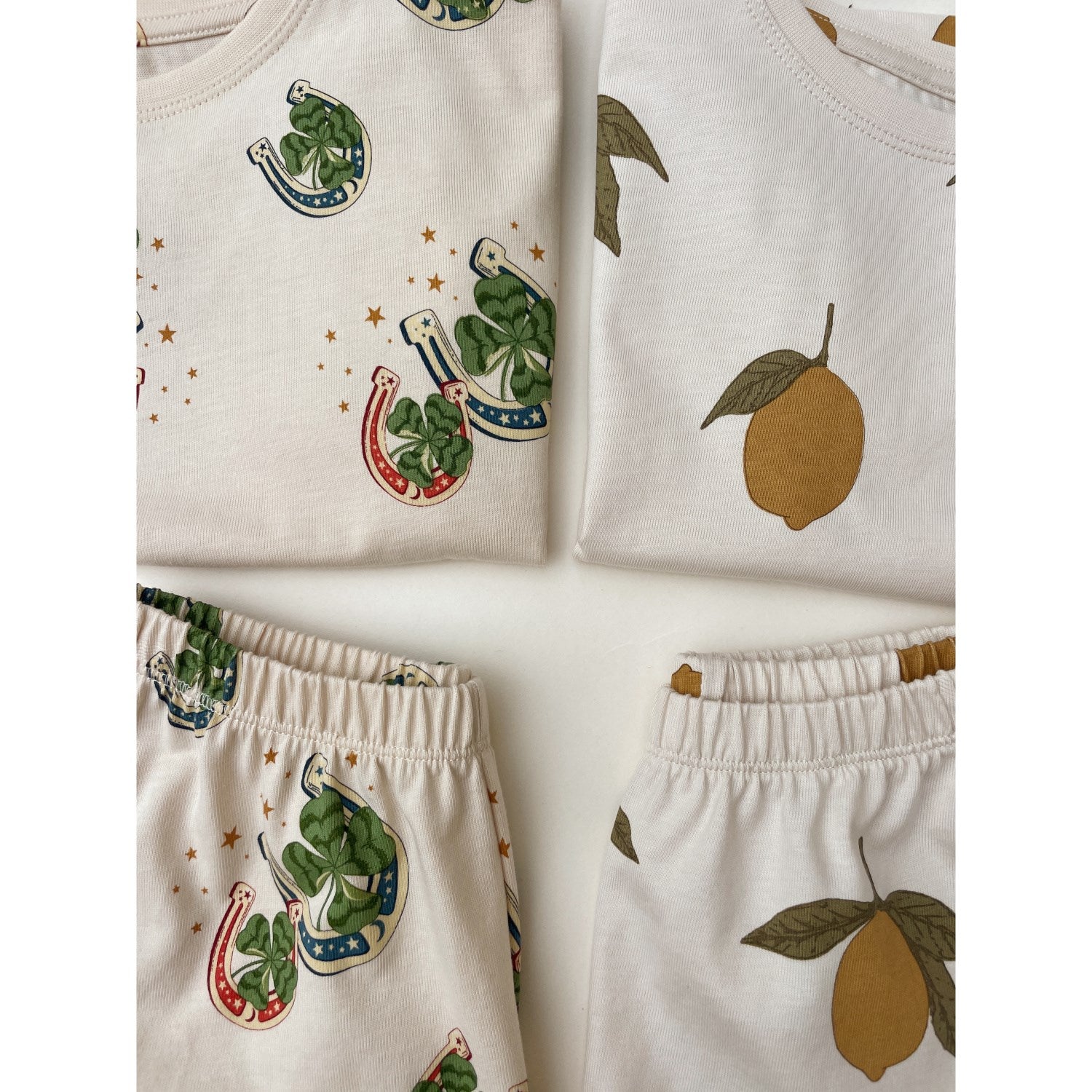 Gi barnet ditt en herlig sommeropplevelse med Konges Sløjd Mon Grand Citron Lin Sett Gots. Dette sjarmerende settet er laget av klassisk økologisk bomull som sikrer både komfort og holdbarhet. Designet inkluderer en t-skjorte med korte ermer og myke shorts med elastisk linning, perfekt for lek og rastløse dager. Den lette stoffblandingen gir en ideell passform og føles behagelig mot sensitiv barnehud. Ta vare på settet ved å vaske det skånsomt, slik at barnet ditt kan nyte de solfylte dagene i stil og komfort.