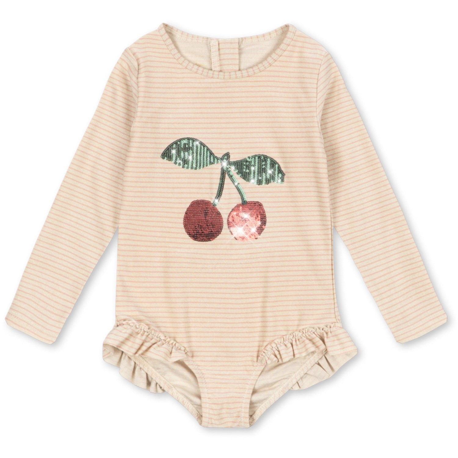 Gjør stranddagen ekstra stilfull med Konges Sløjd Rose Stripe Jade Ls badedrakt. Denne langermede badedrakten har en skinnende finish og sjarmerende paljetter foran, sammen med søte volangdetaljer ved benåpningene. Praktisk utformet med en solid glidelås bak for enkel av og påkledning. For de minste fra 6 til 18 måneder er det også praktiske trykknapper ved beinåpningen. En kombinasjon av stil, komfort og funksjonalitet som gjør badetøy til en lek!