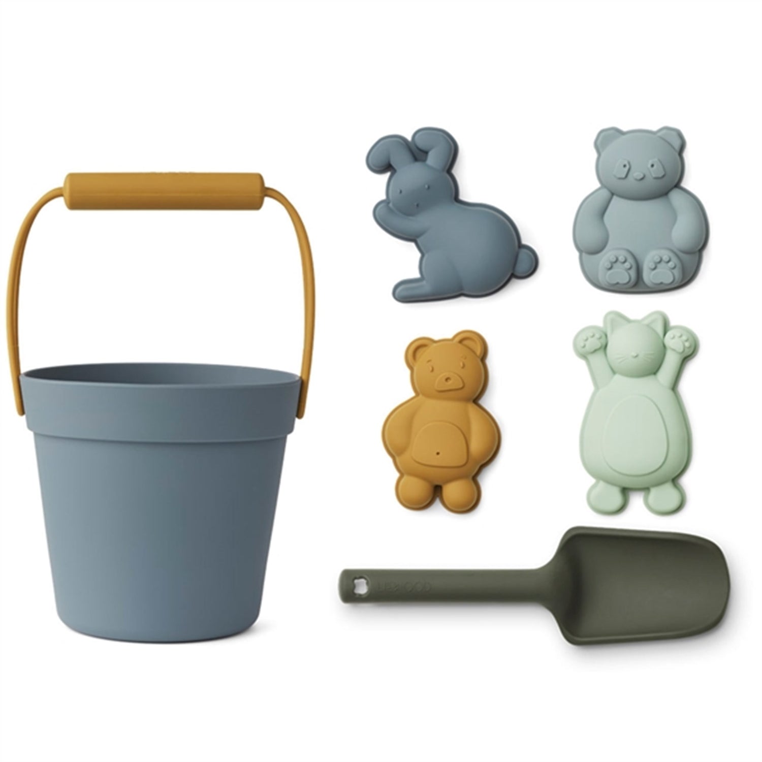 I tillegg til en bøtte med håndtak og spade, inneholder settet også former for sandkreasjoner, inkludert en kanin og en bamse.