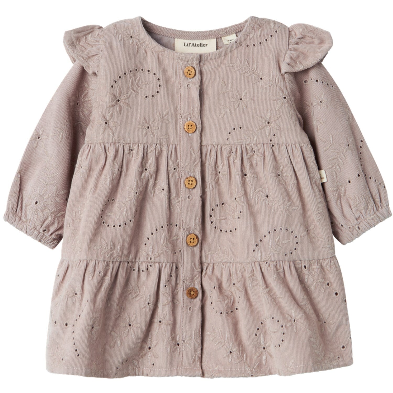 Oppdag Lil'Atelier Etherea Bine Loose Corduroy-kjolen, et must-have for barnas garderobe. Denne kjolen er laget av lustrøs kordfløyel med en myk, fløyelsaktig ribbeoverflate som tilbyr komfort og stil. Med en løstsittende passform, rund hals og lange ermer med elastiske mansjetter, er denne kjolen ikke bare stilfull, men også praktisk med sitt knapp- og løkkefeste. Broderidetaljer og frills tilfører en ekstra sjarm. Holdbar og lett å vedlikeholde, er kjolen ideell for både lek og spesielle anledninger. Sikkerheten er også ivaretatt med tydelige advarsler om å holde kjolen unna brann.